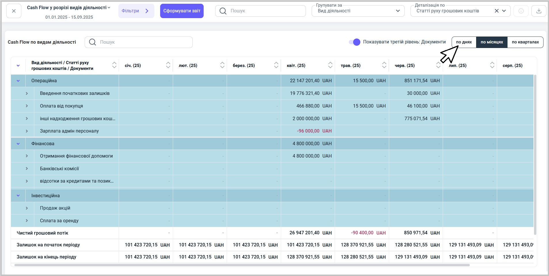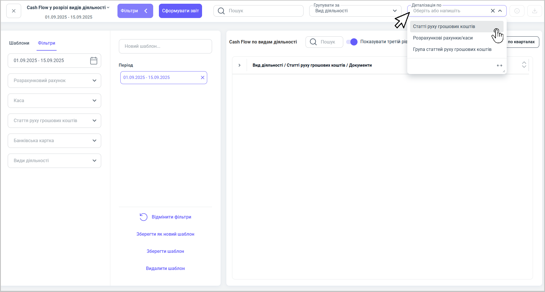 🔹Оберіть спосіб деталізації звіту. Ви можете переглядати дані за статтями руху грошових коштів, розрахунковими рахунками/касам та групами статтей руху грошових коштів .