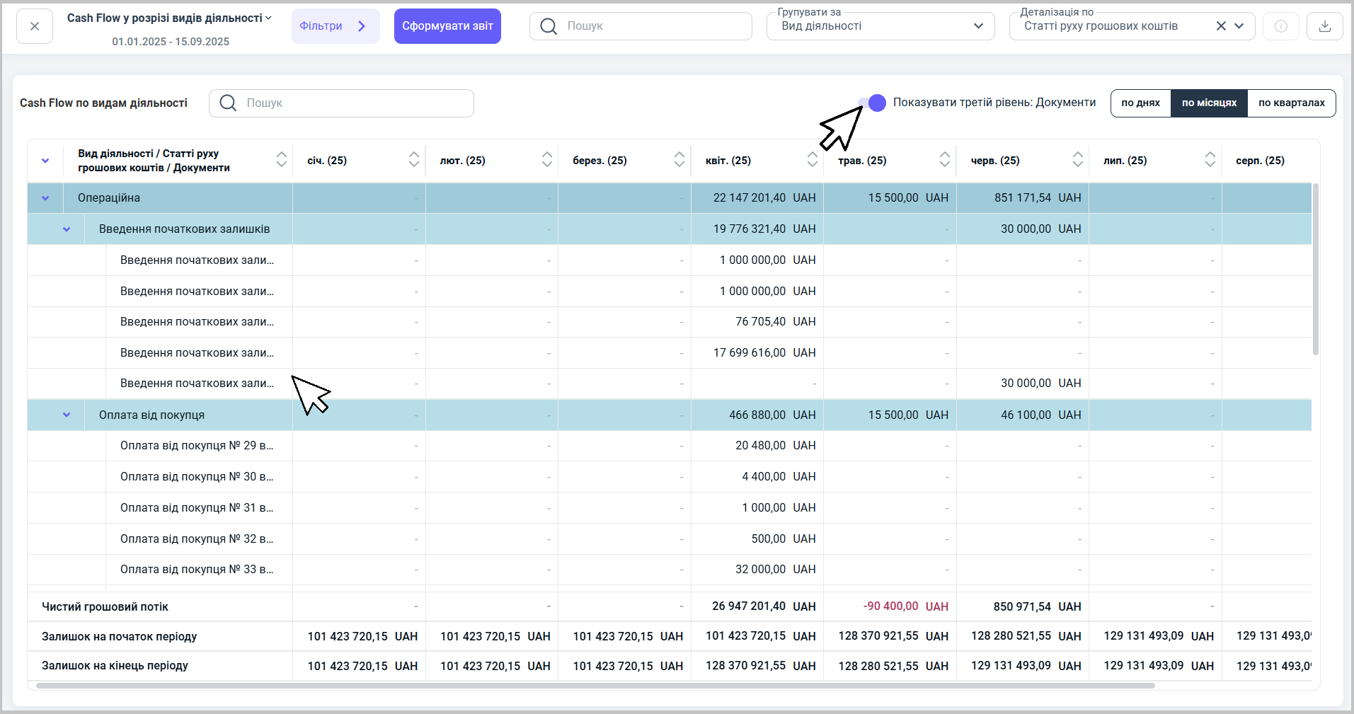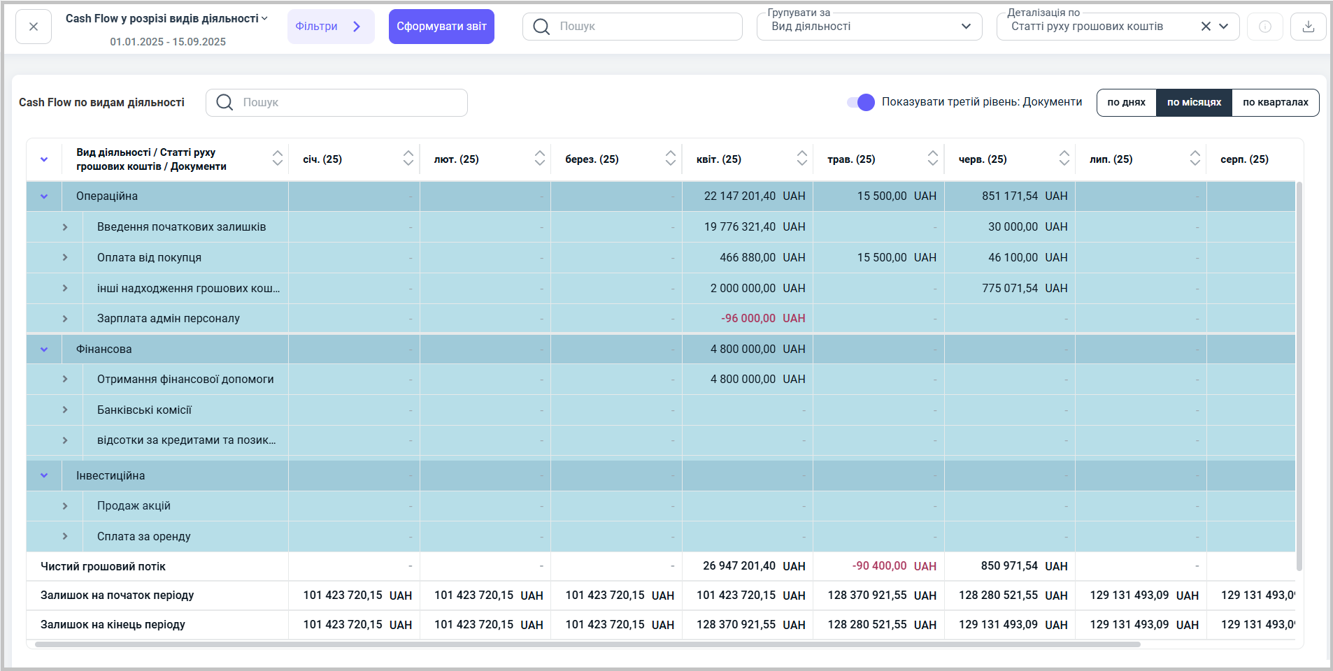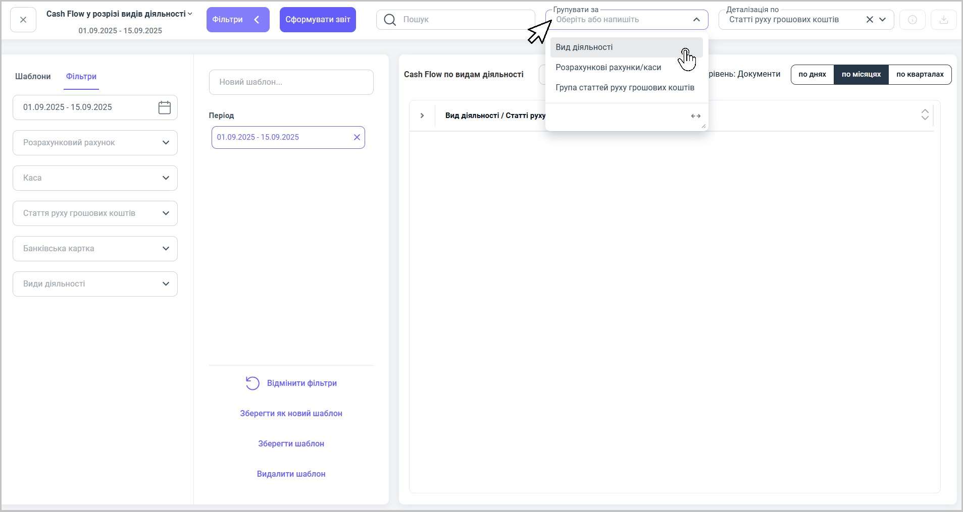 🔹Доступне групування звіту за видом діяльності, розрахунковими рахунками/касам та групами статтей руху грошових коштів.