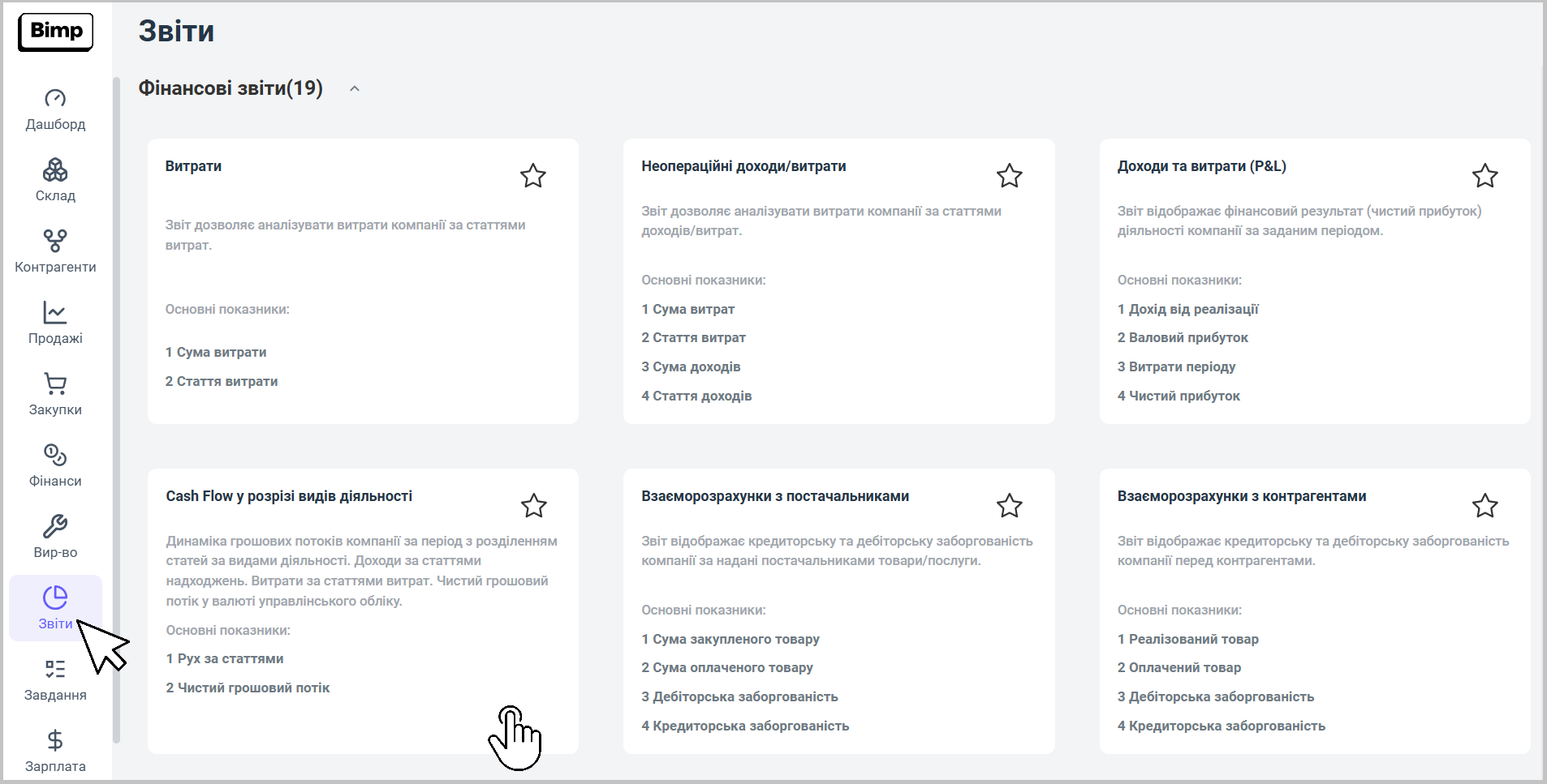 🔹Перейдіть до модуля "Звіти" та оберіть звіт "Cash Flow у розрізі видів діяльності".