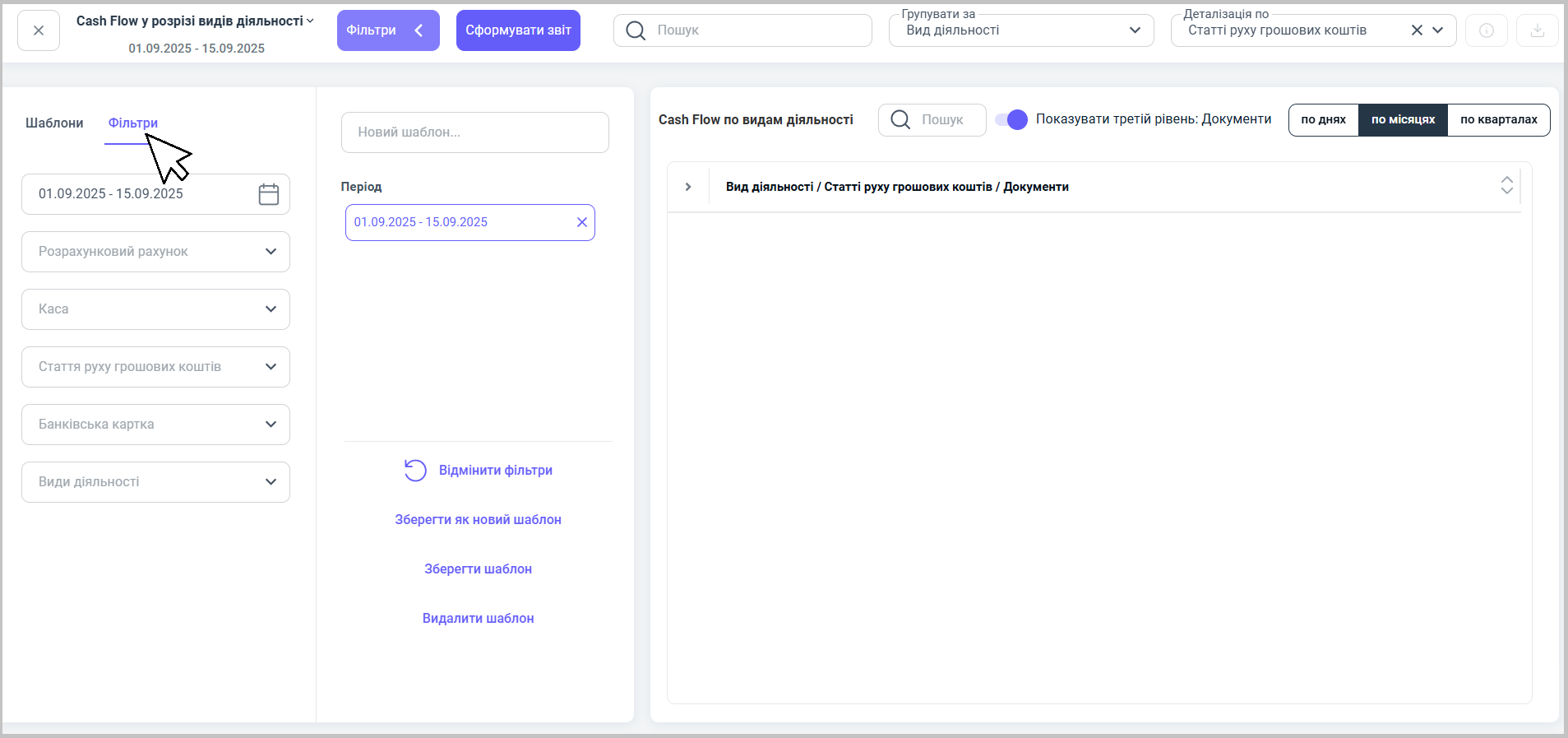 🔹Відкриється форма для побудови звіту, де ви можете застосувати фільтри за періодом, розрахунковим рахунком, касою, статтею руху грошових коштів, банківською картою та видом діяльності.