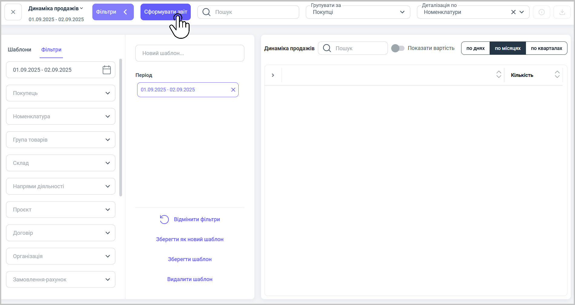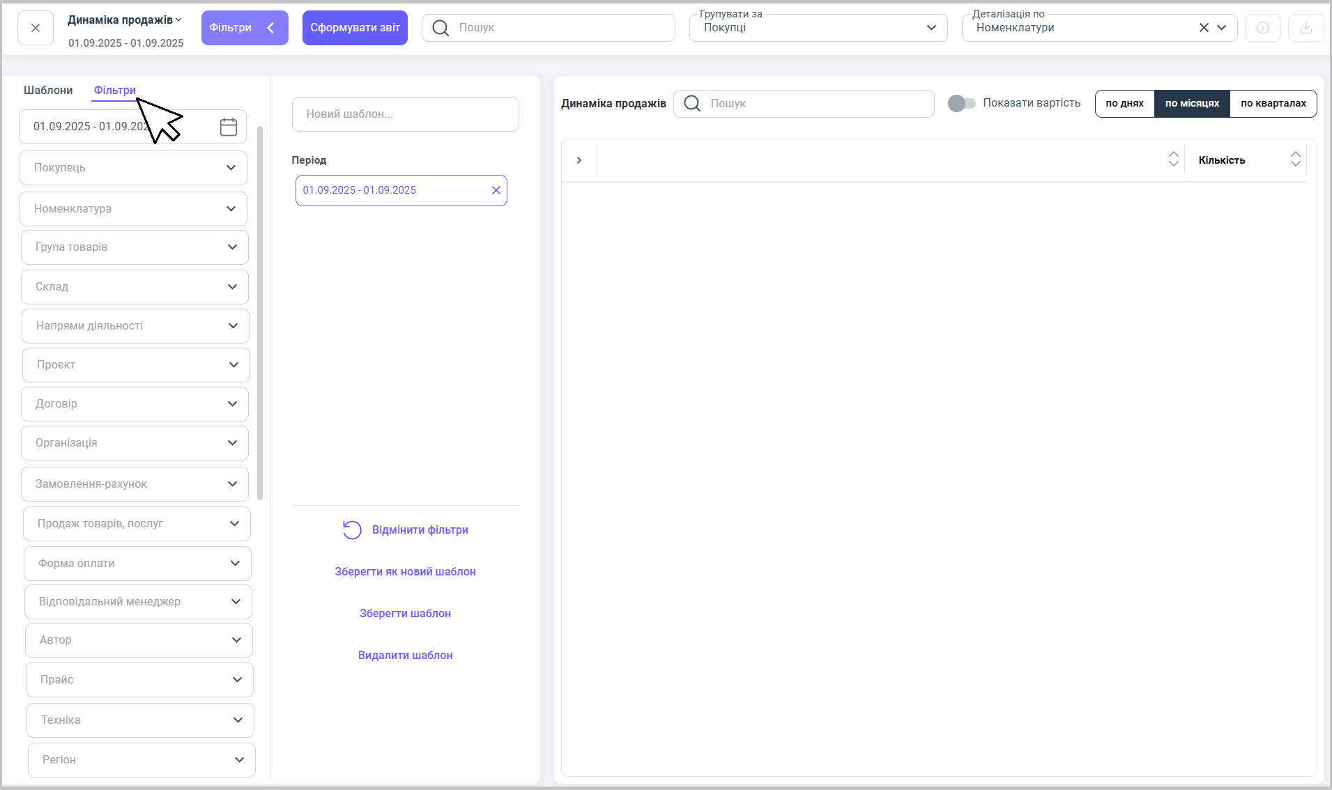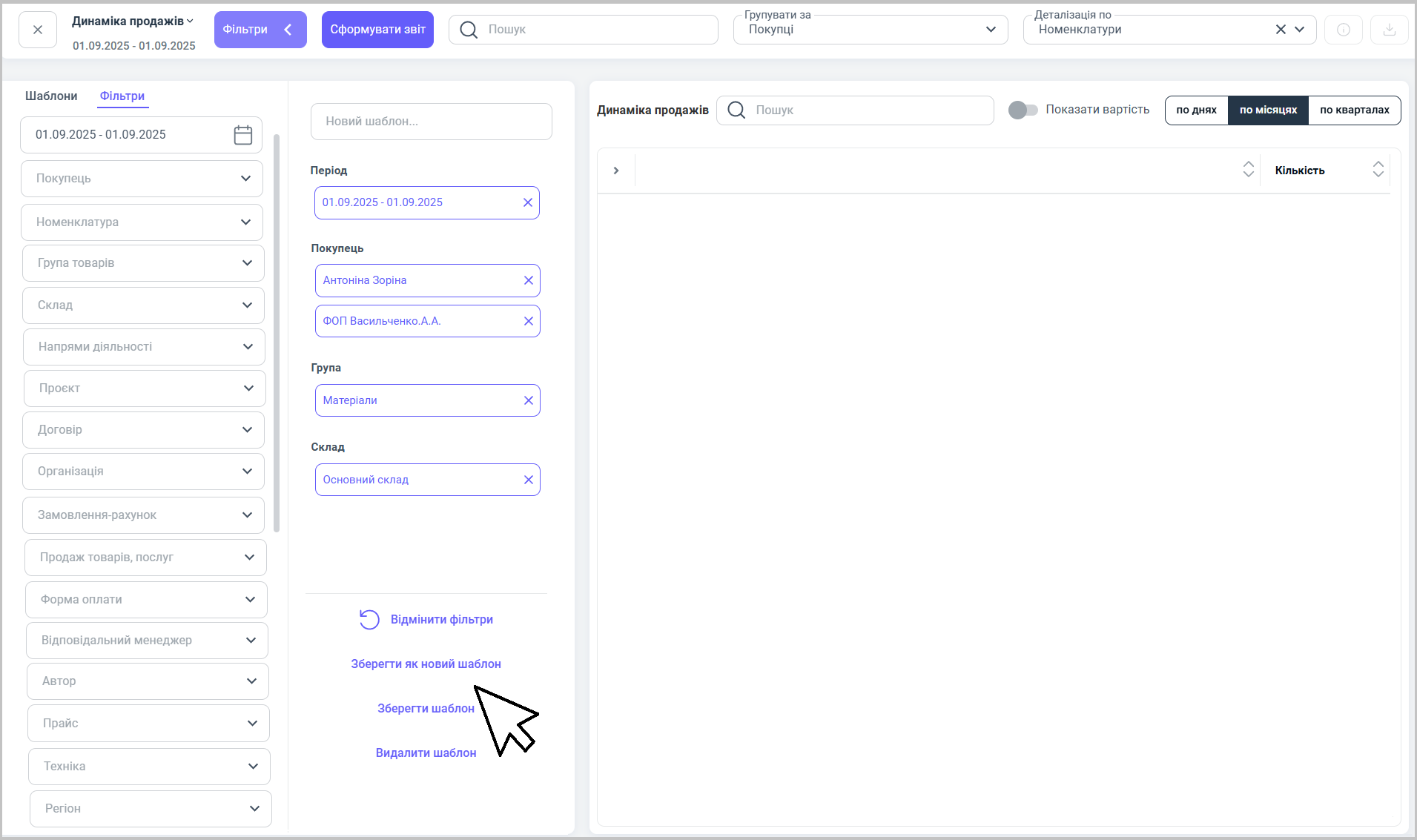 🔹Фільтри можна відмінити, зберегти як новий чи редагувати існуючий шаблон або видалити. Вибраний часовий період у звіті можна зберегти як шаблон.