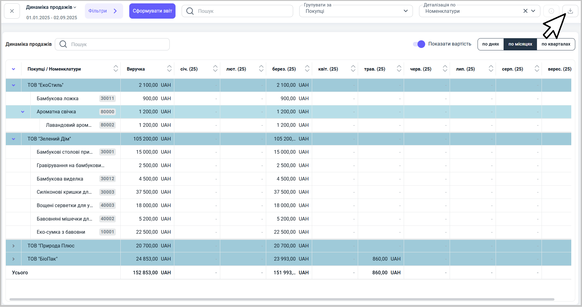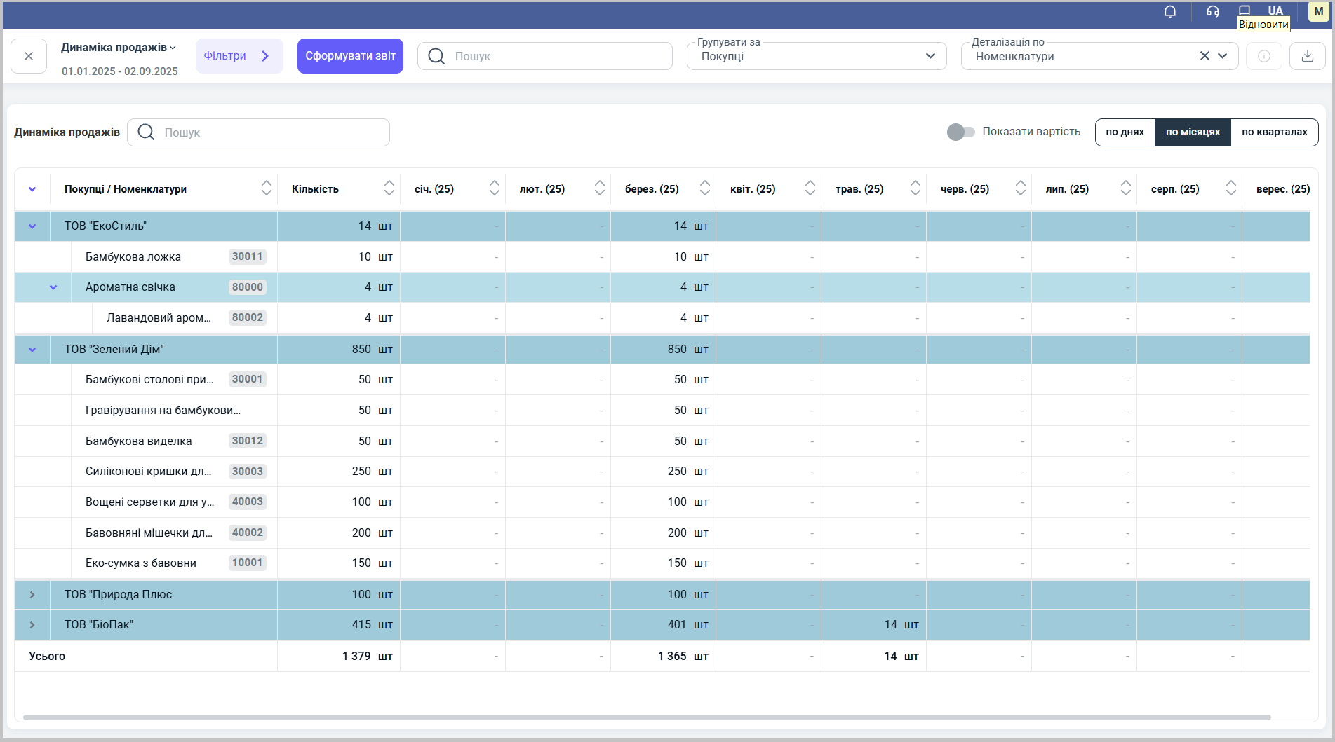 🔹У залежності від обраного способу групування та деталізації відображатимуться дані про покупців, номенклатури та кількість реалізованого товару.