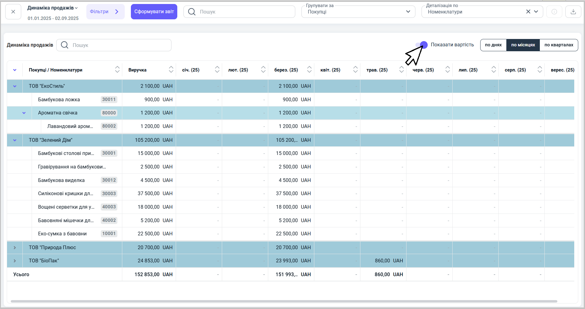 🔹Аби у звіті відображалась вартість проданого товару, активуйте перемикач "Показати вартість"