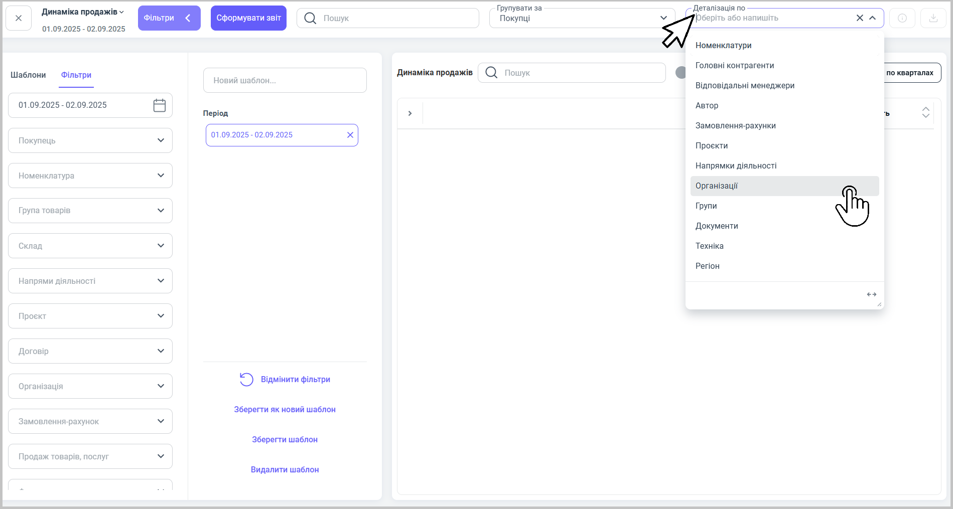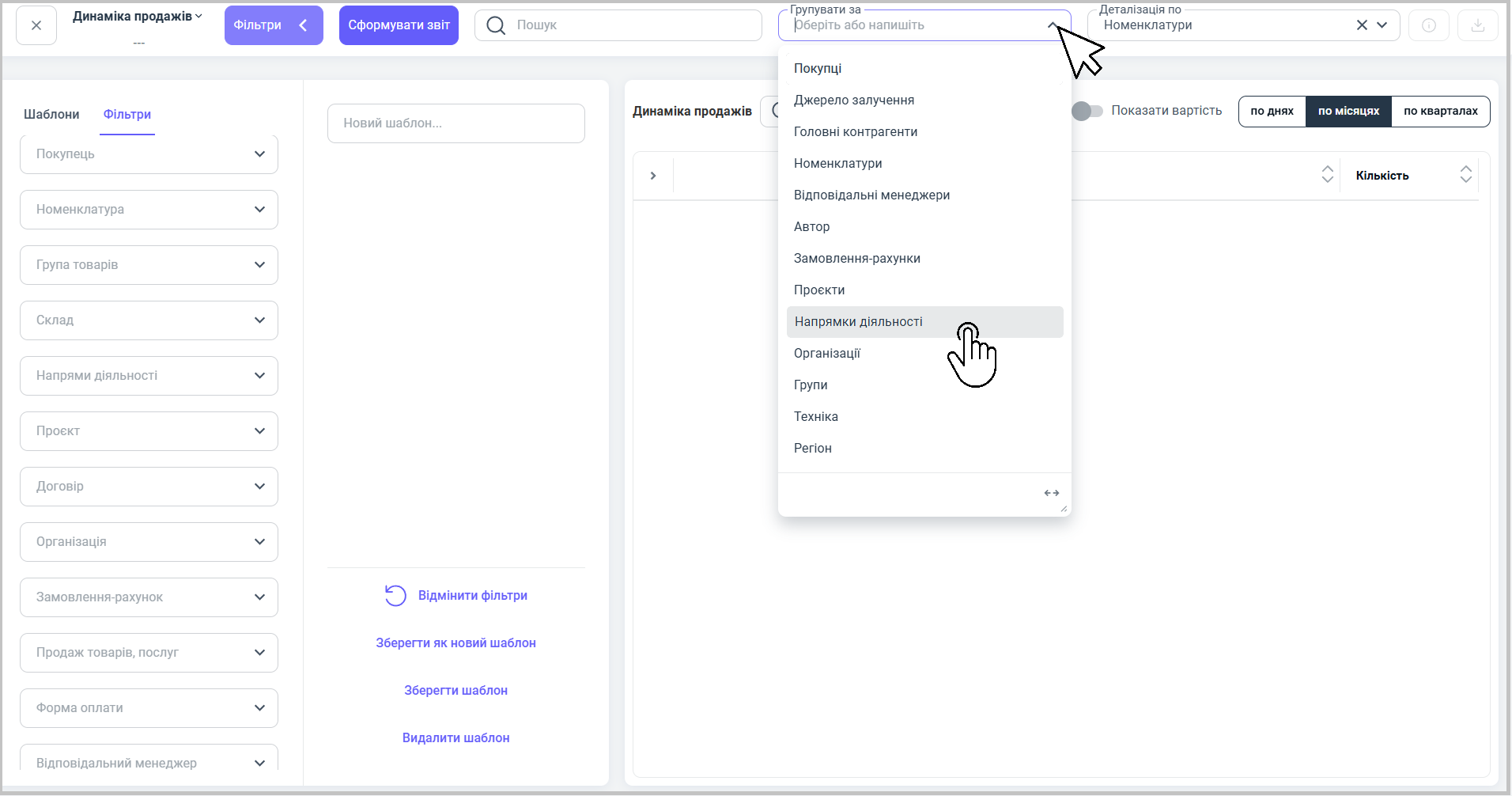 🔹Оберіть спосіб деталізації звіту. Ви можете переглядати дані за номенклатурами, головними контрагентами, відповідальними менеджерами, автором, замовленнями-рахунками, проєктами, напрямами діяльності, організаціями, групами, документами, технікою або регіоном.