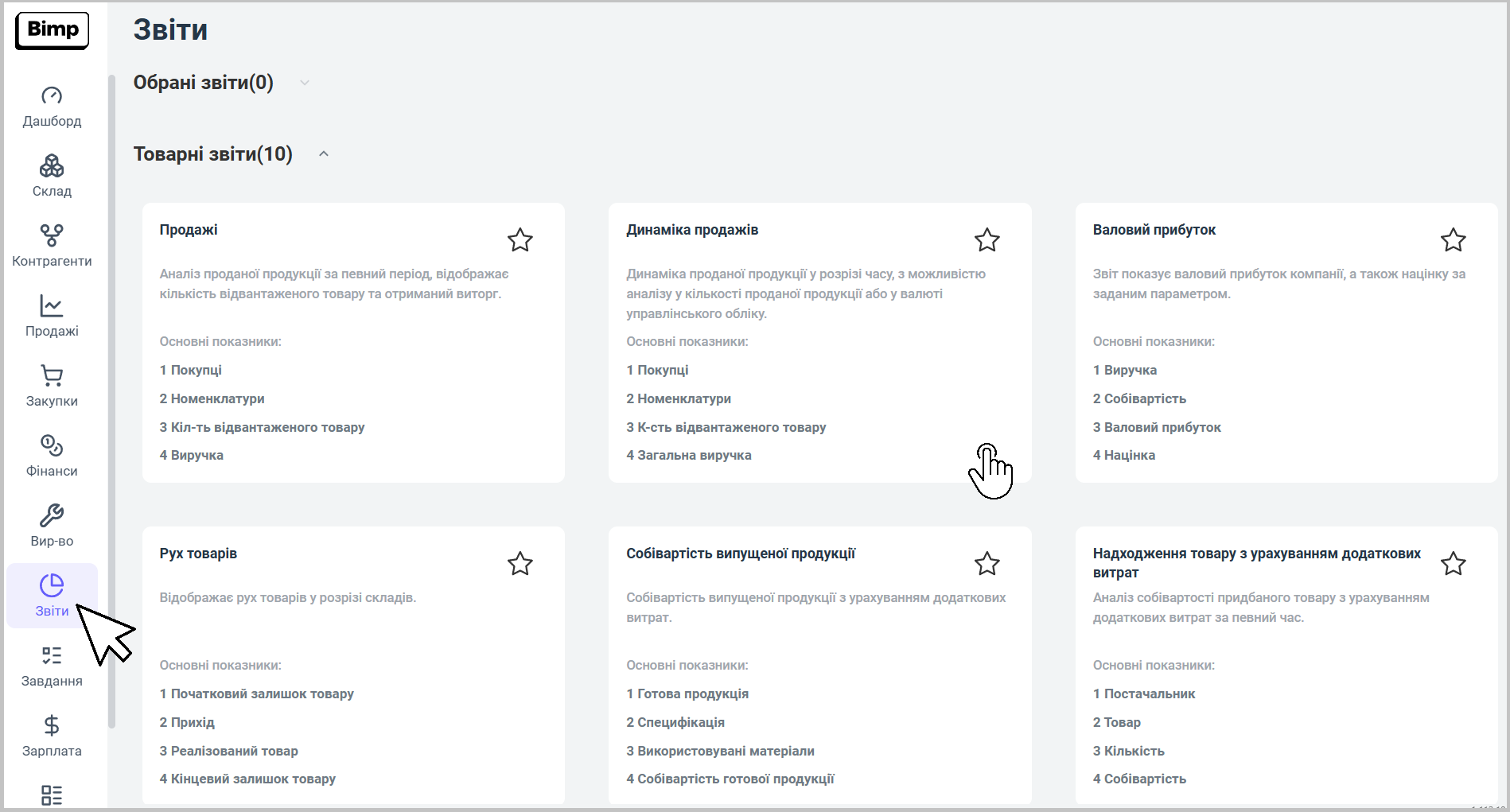 🔹Перейдіть до модуля "Звіти" та оберіть звіт "Динаміка продажів"