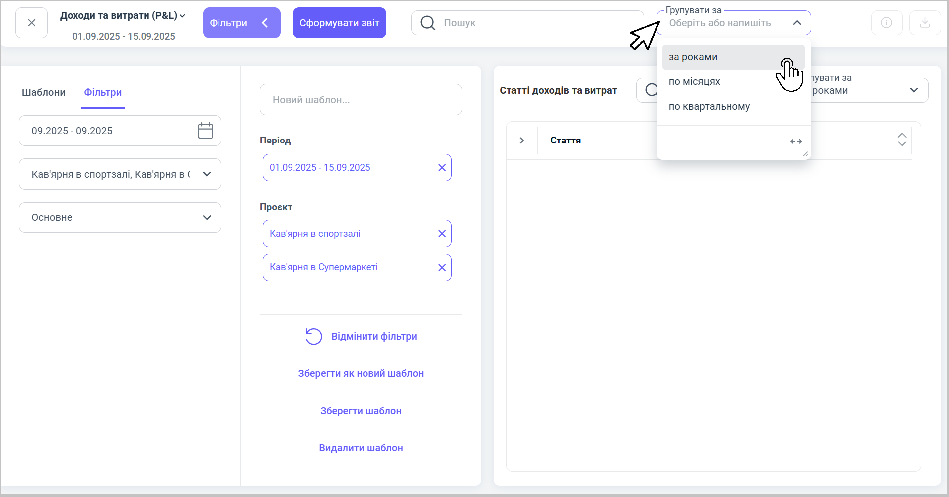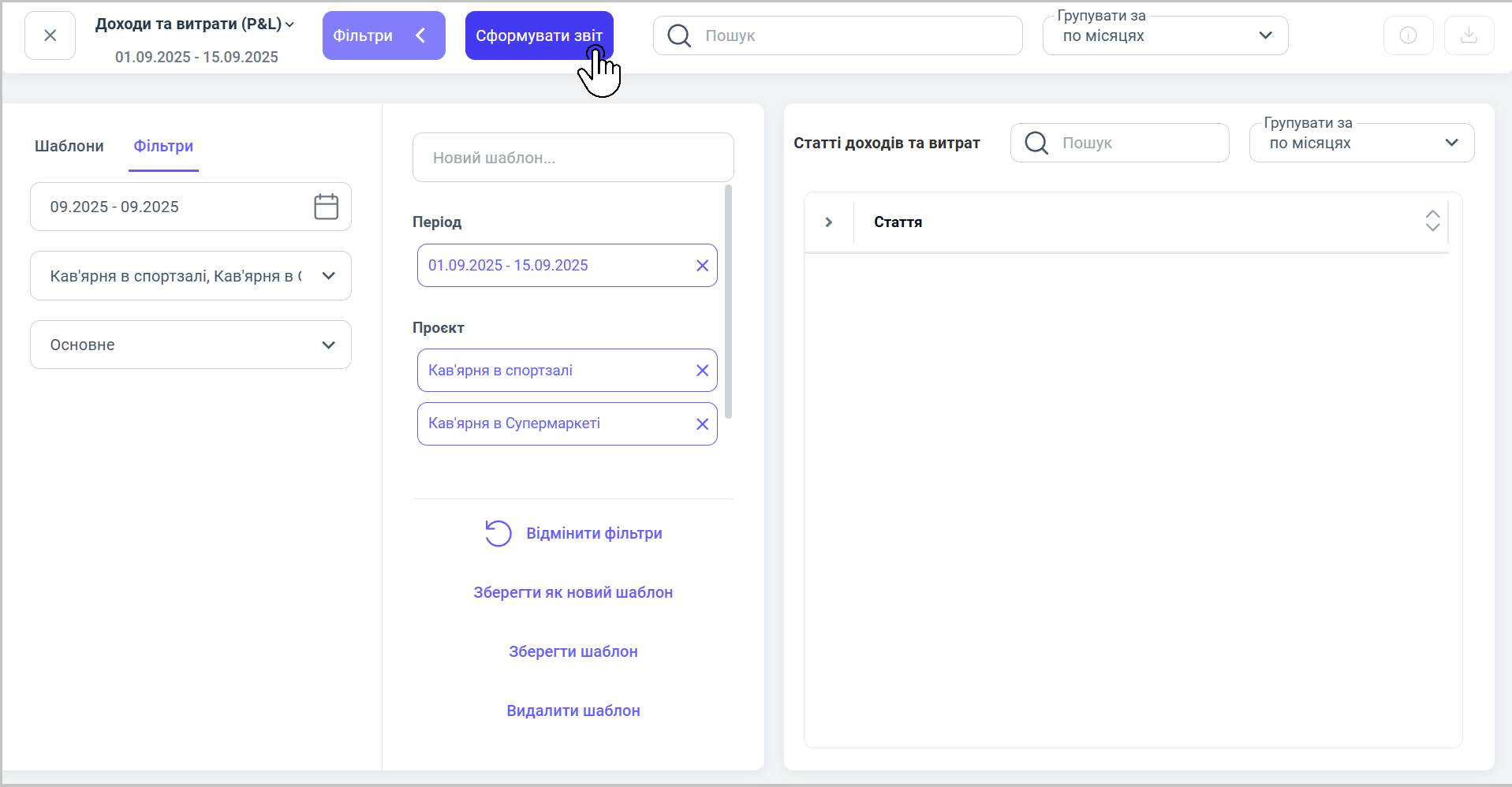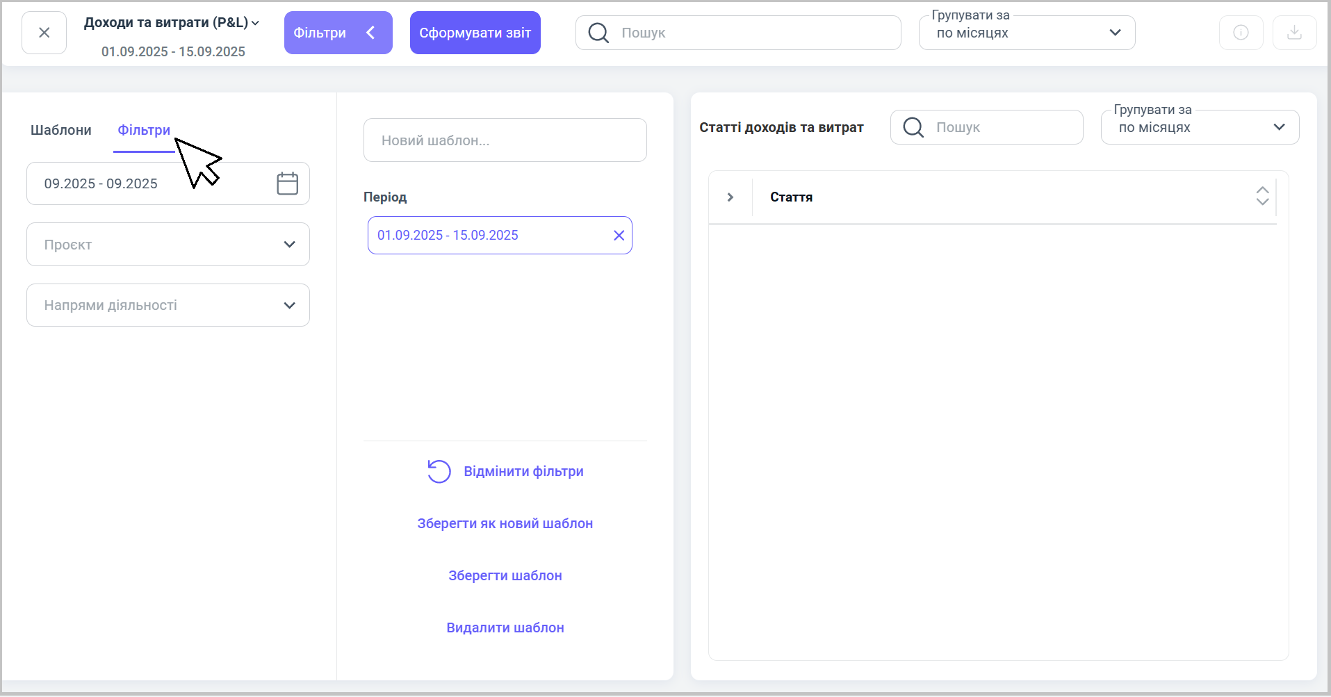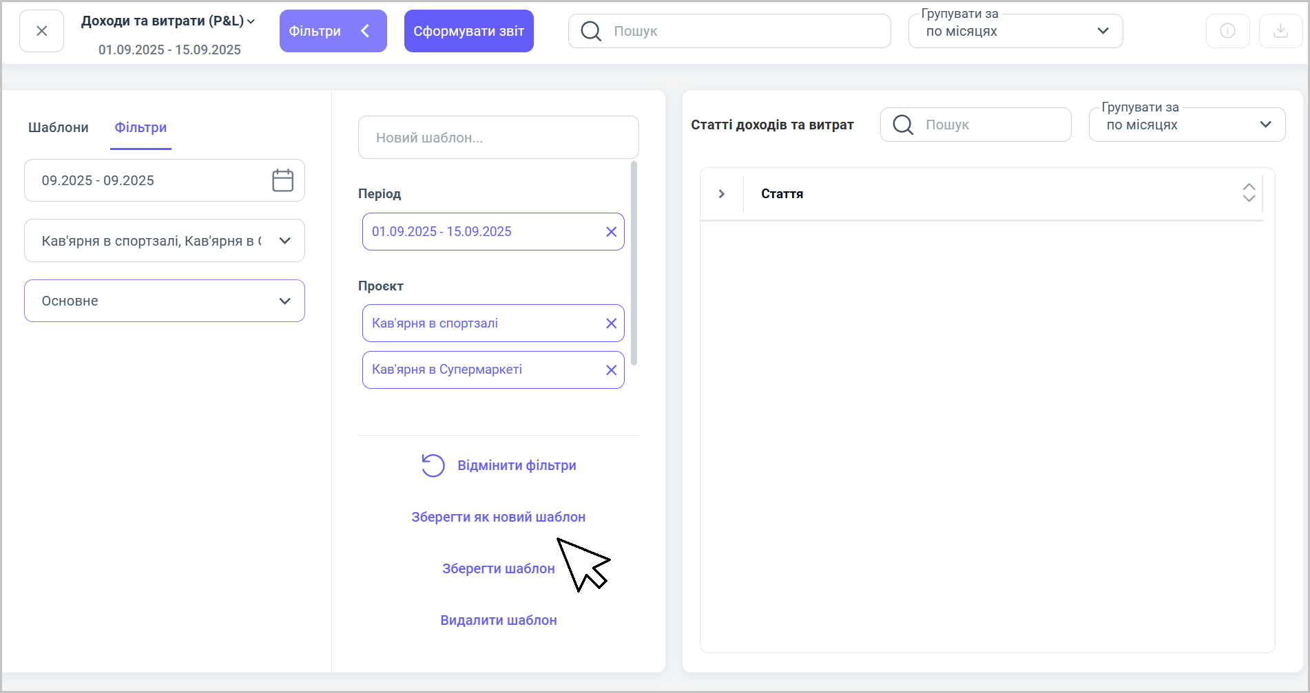 🔹Фільтри можна відмінити, зберегти як новий чи редагувати існуючий шаблон або видалити. Вибраний часовий період у звіті можна зберегти як шаблон.