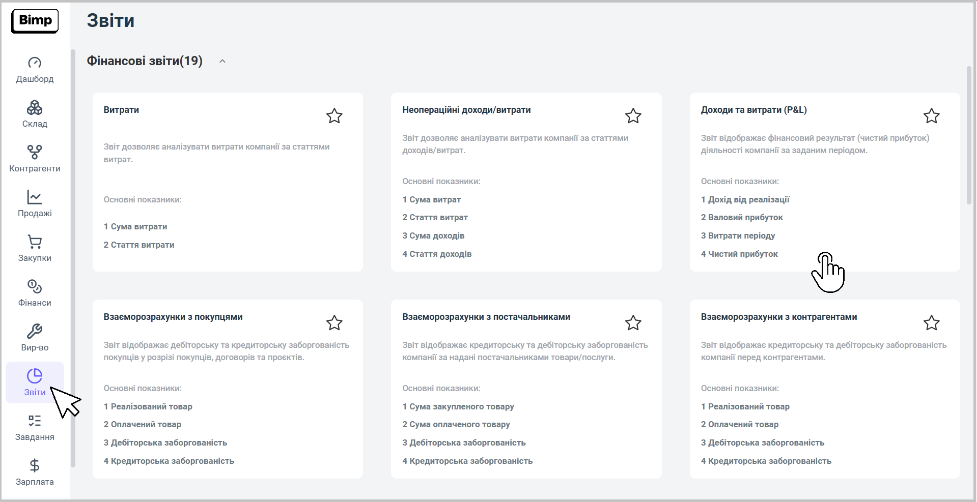 🔹Перейдіть до модуля "Звіти" та оберіть звіт "Доходи та витрати (P&L)".