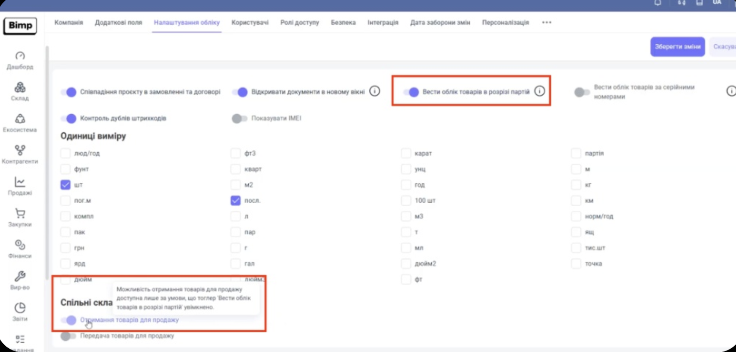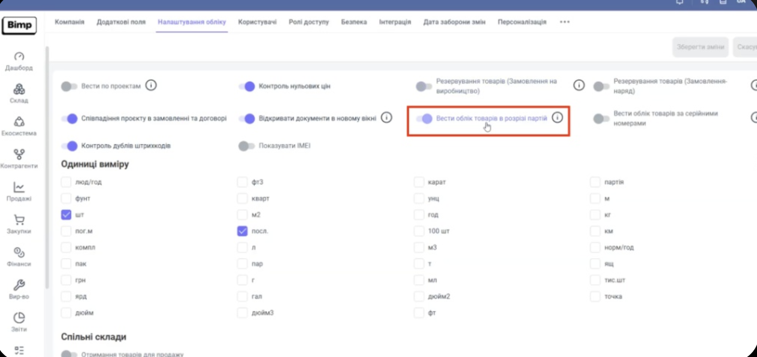 Знайдіть та увімкніть перемикач «Вести облік товарів в розрізі партій»