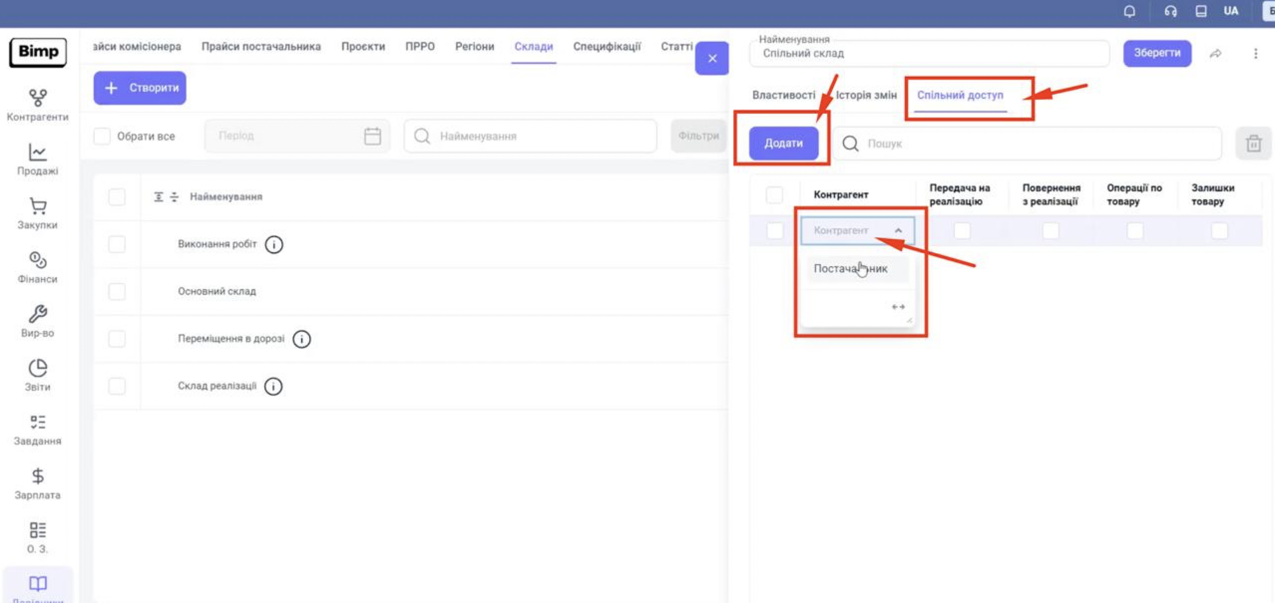 Уявімо, що Компанія А (Виробник) хоче передати партію товару в Компанію Б (Шоурум). Щоб Виробник бачив у своєму Bimp, скільки одиниць продано в Шоурумі, їм потрібно обмінятися своїми унікальними ID та налаштувати спільний склад.
