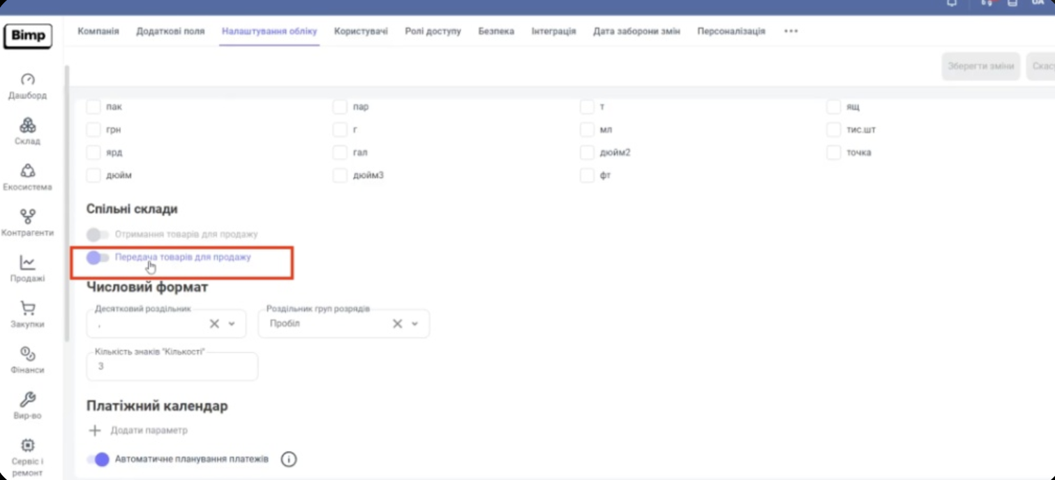 У блоці "Спільні склади" увімкніть перемикач «Передача товарів для продажу»