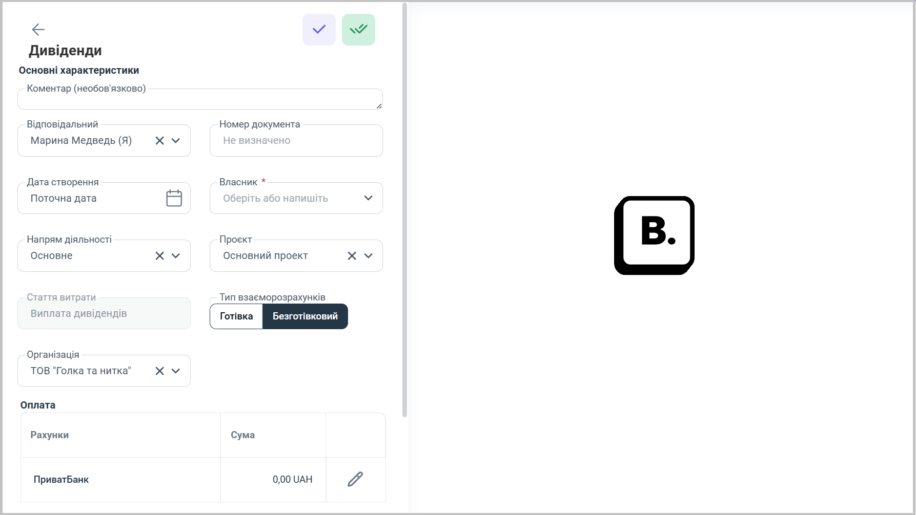 🔹Поле "Стаття витрат" недоступне для редагування, оскільки для виплати дивідендів у сервісі використовується лише одна стаття — "Виплата дивідендів".