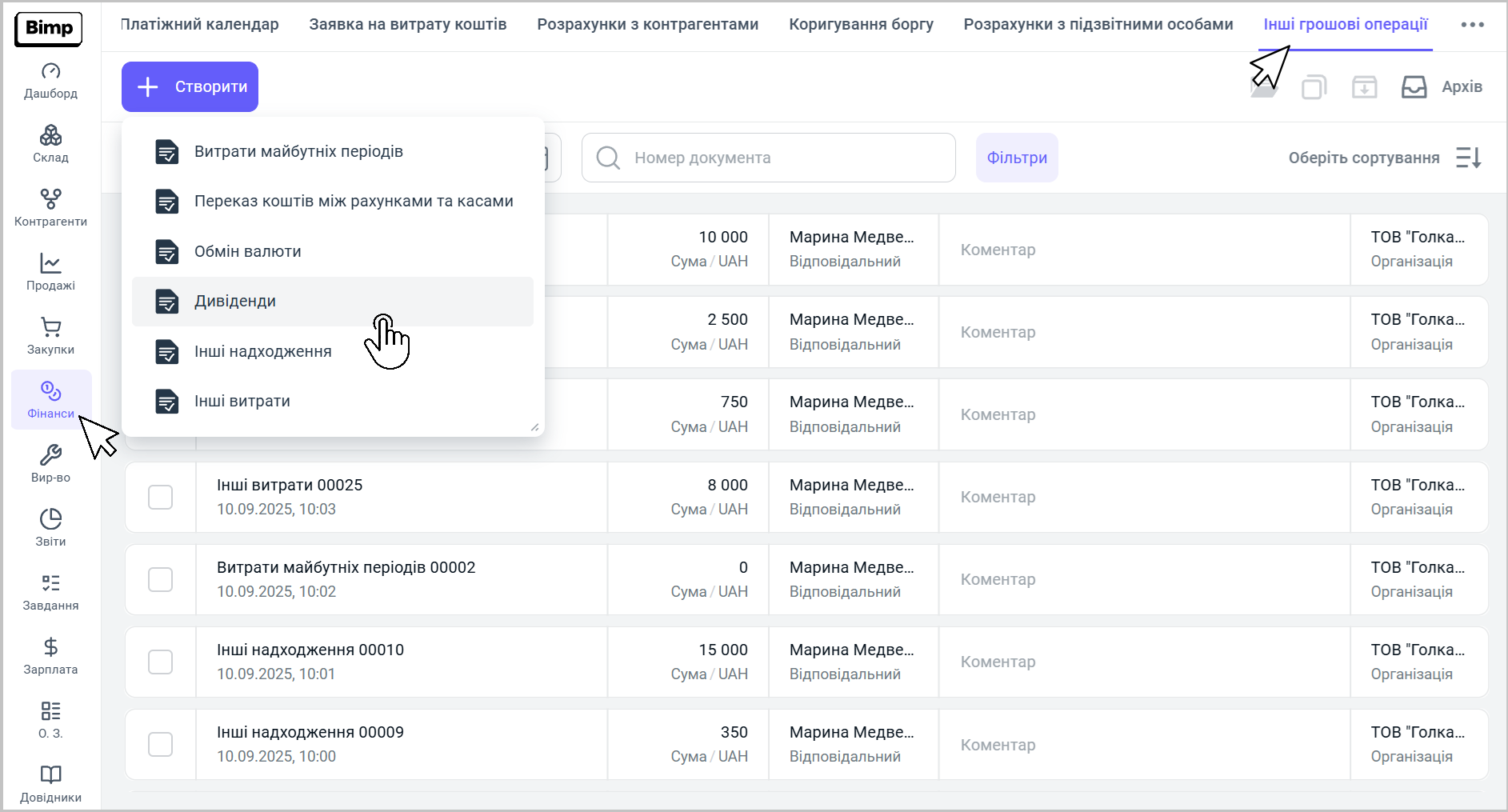 🔹У блоці "Фінанси", у розділі "Інші грошові операції", натисніть кнопку "Створити" та з випадаючого списку оберіть документ "Дивіденди".