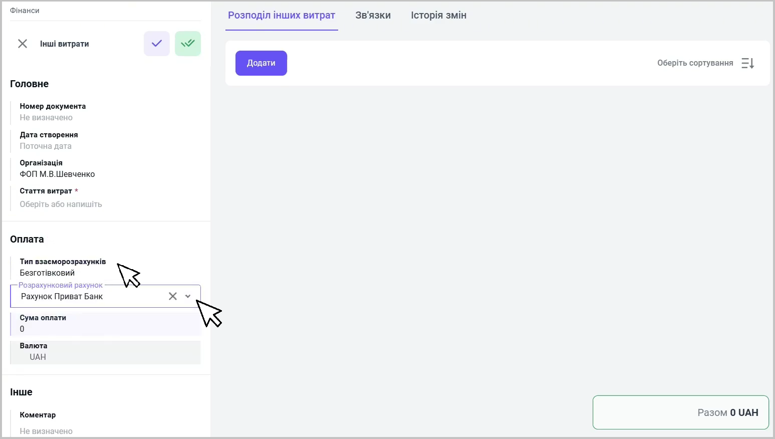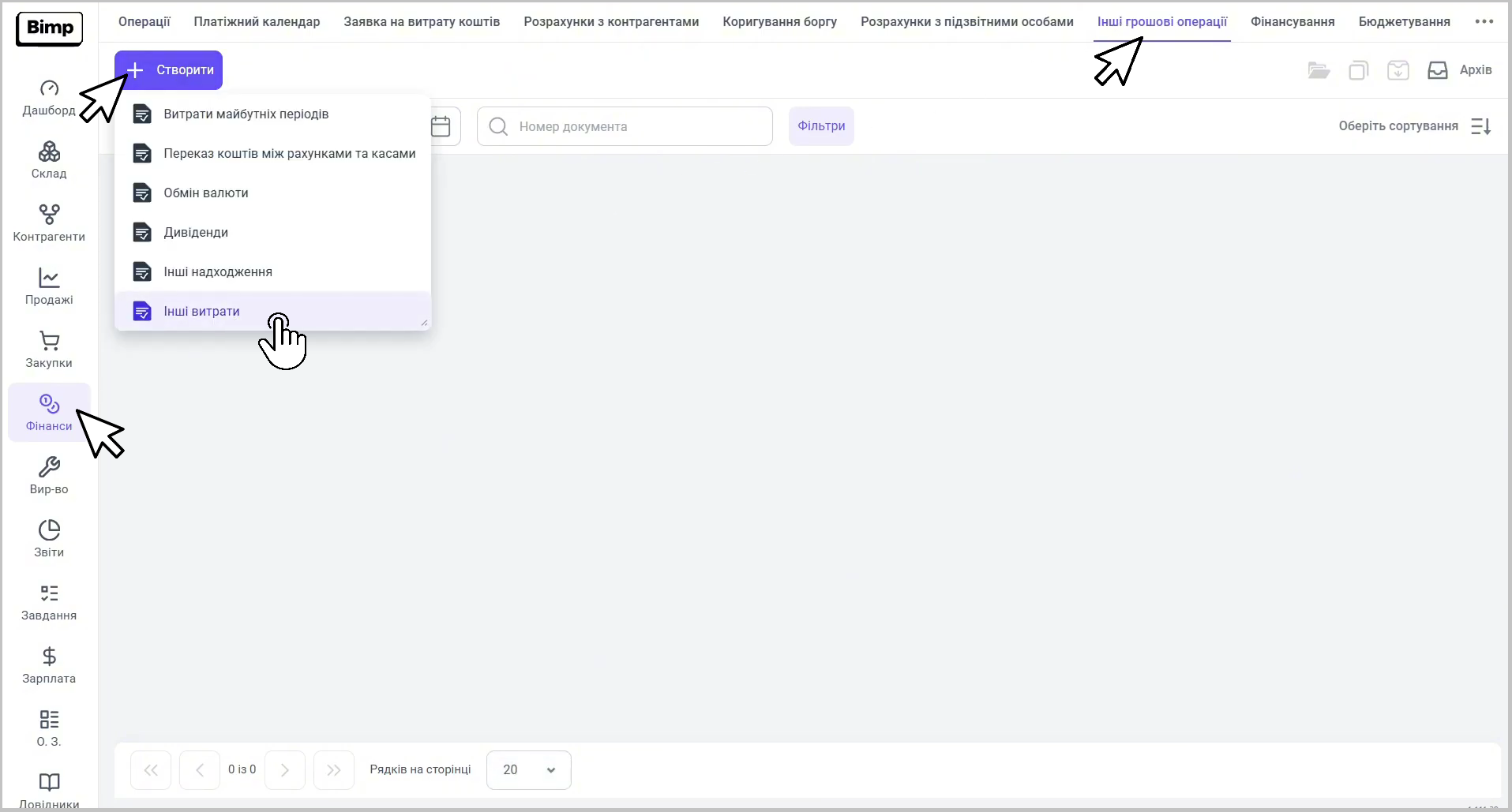 🔹У блоці "Фінанси" в розділі "Інші грошові операції" натисніть "Створити" та оберіть "Інші витрати".