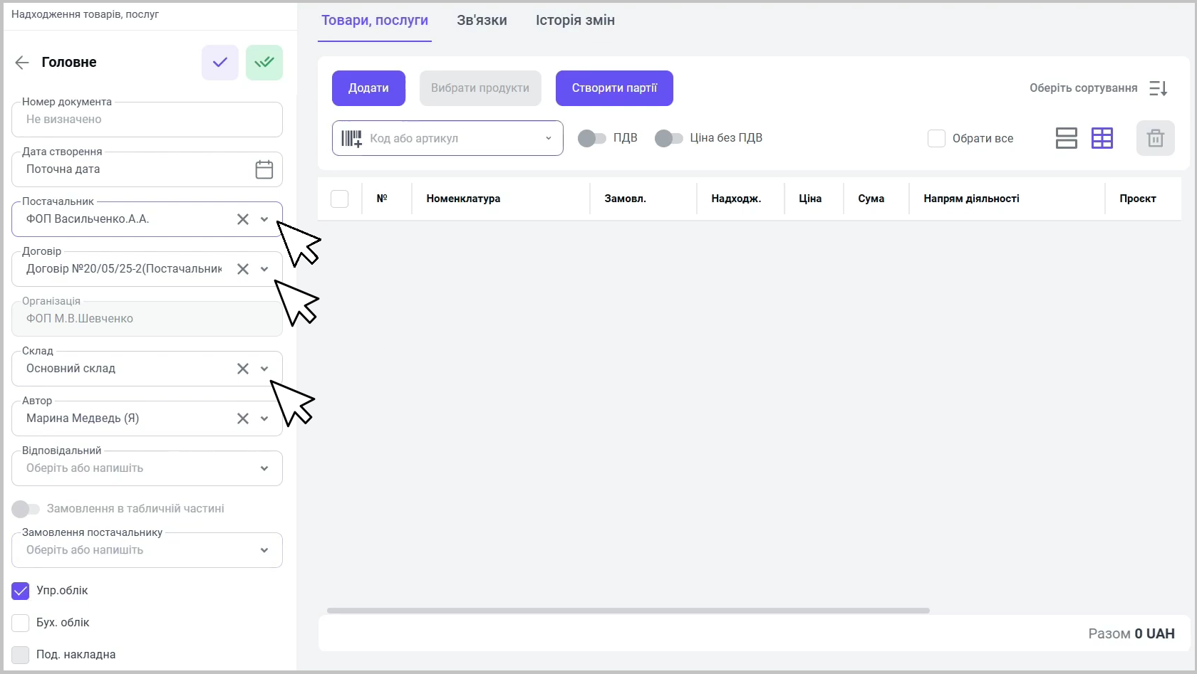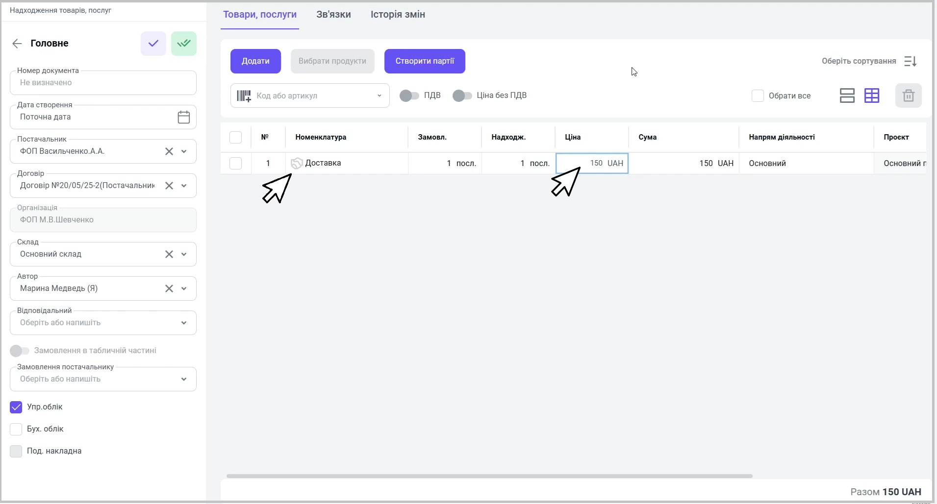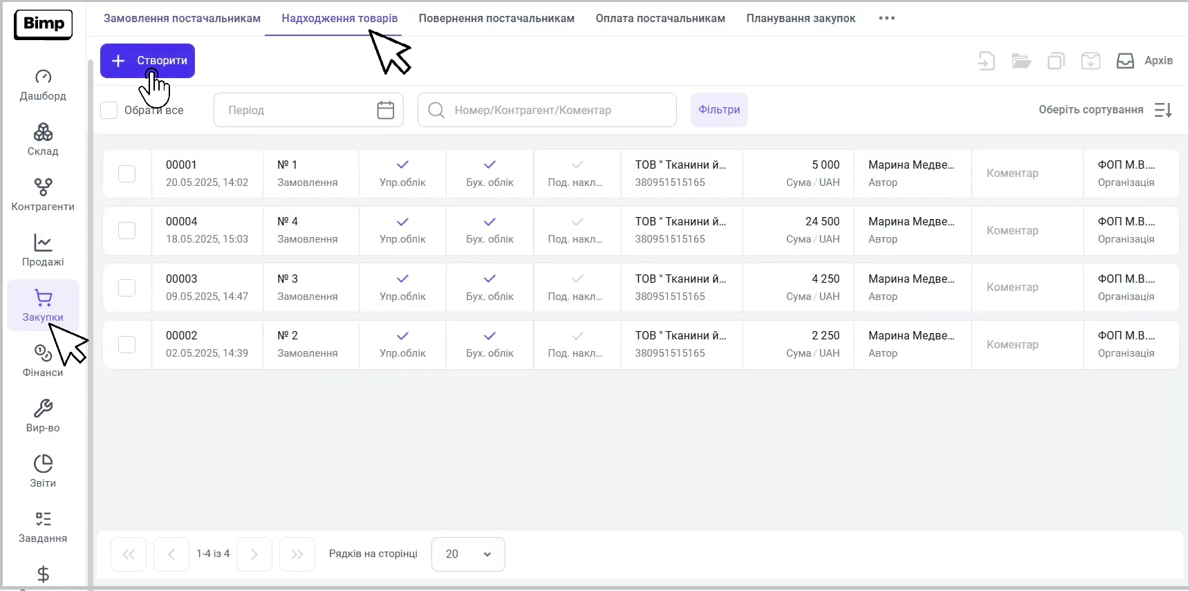 🔹 У блоці "Закупки" створіть документ "Надходження товарів і послуг".
