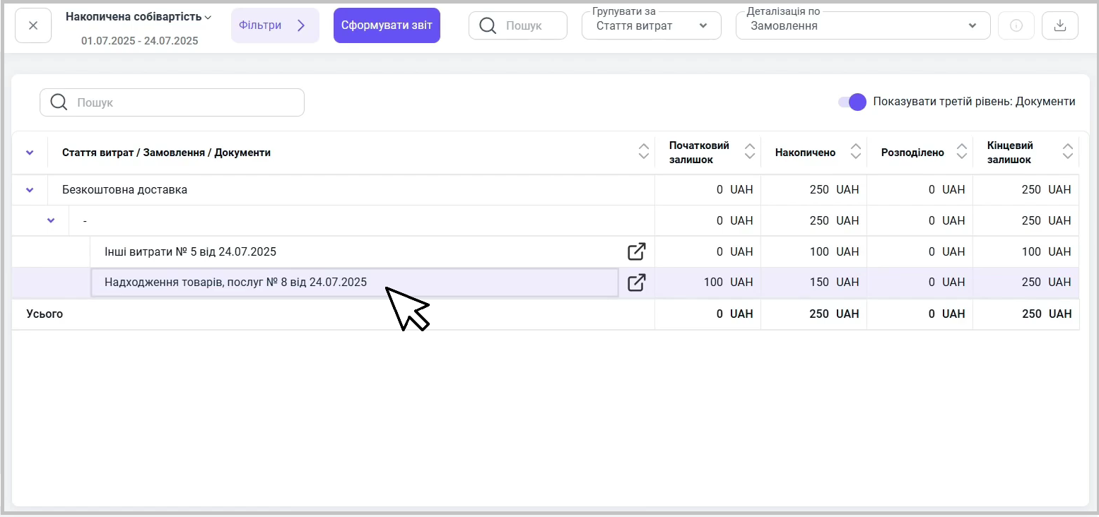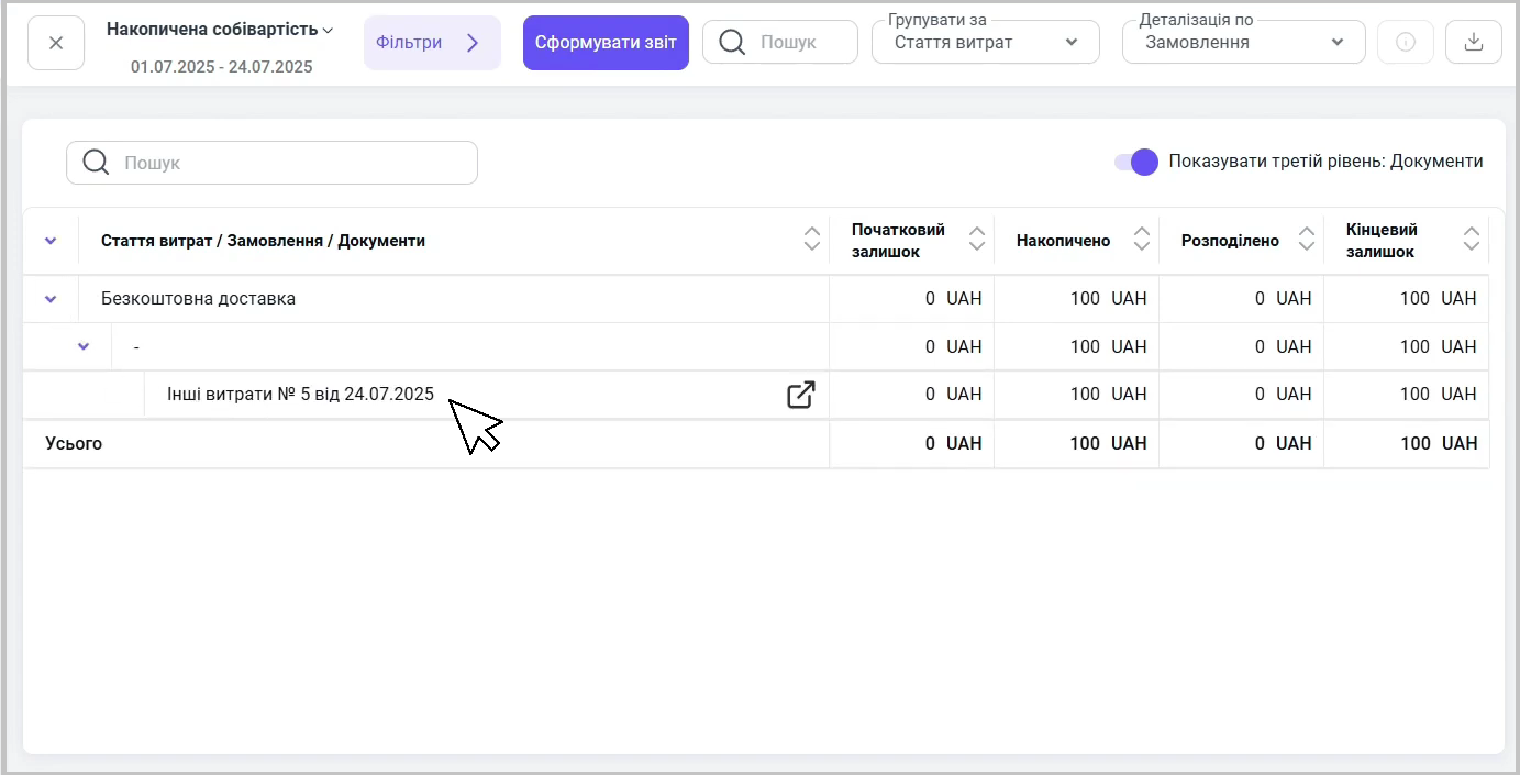 🔹Після цього у звіті "Накопичена собівартість" буде відображено відповідну суму без прив’язки до замовлення.