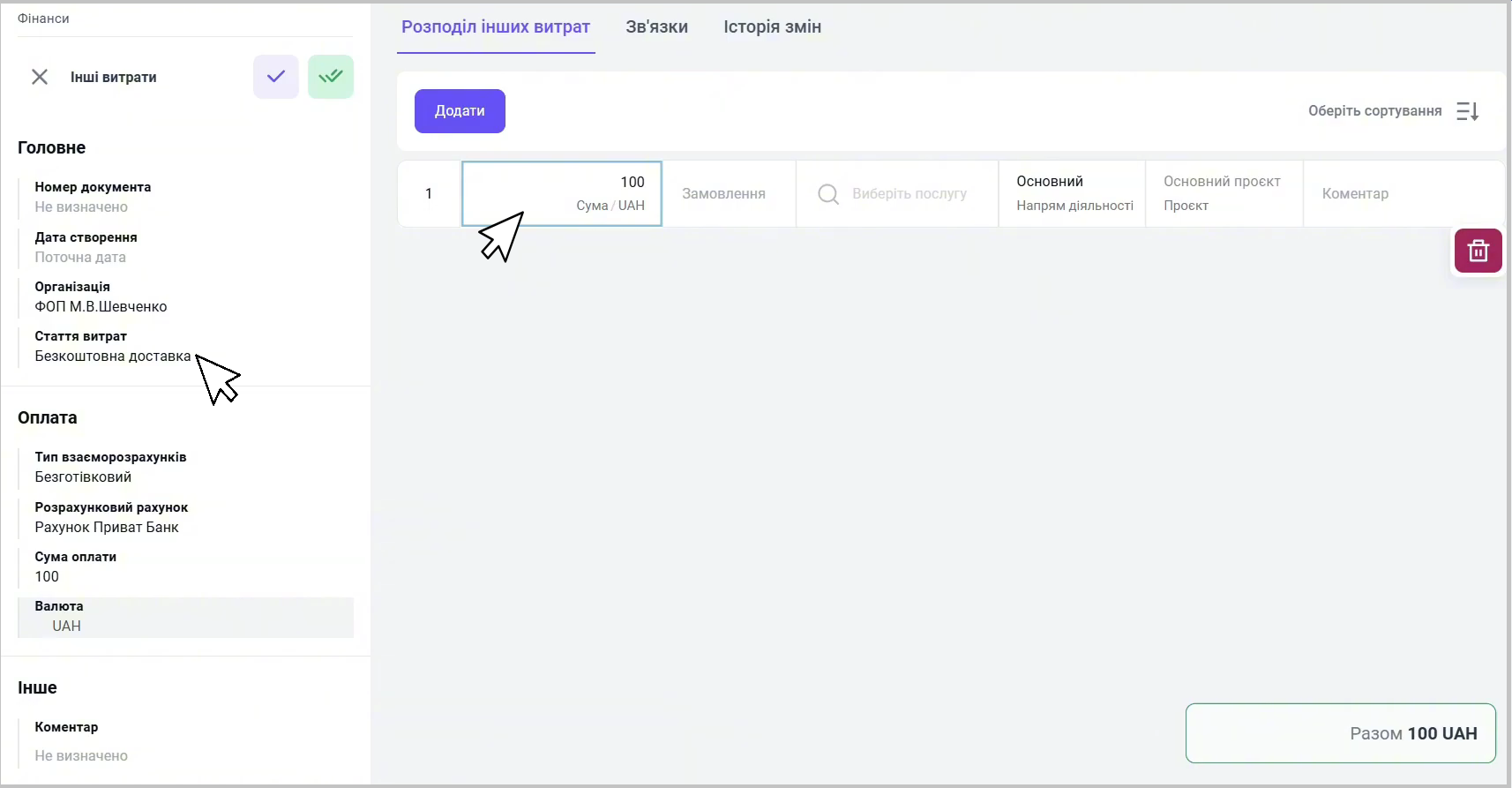 🔹Додайте послугу, яку потрібно віднести на собівартість, та вкажіть кількість та суму вартості.