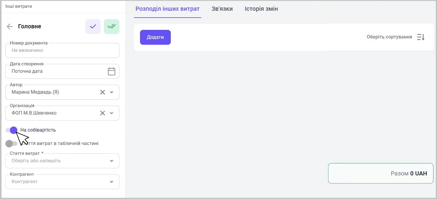 🔹У секції "Головне" потрібно активувати перемикач "На собівартість".