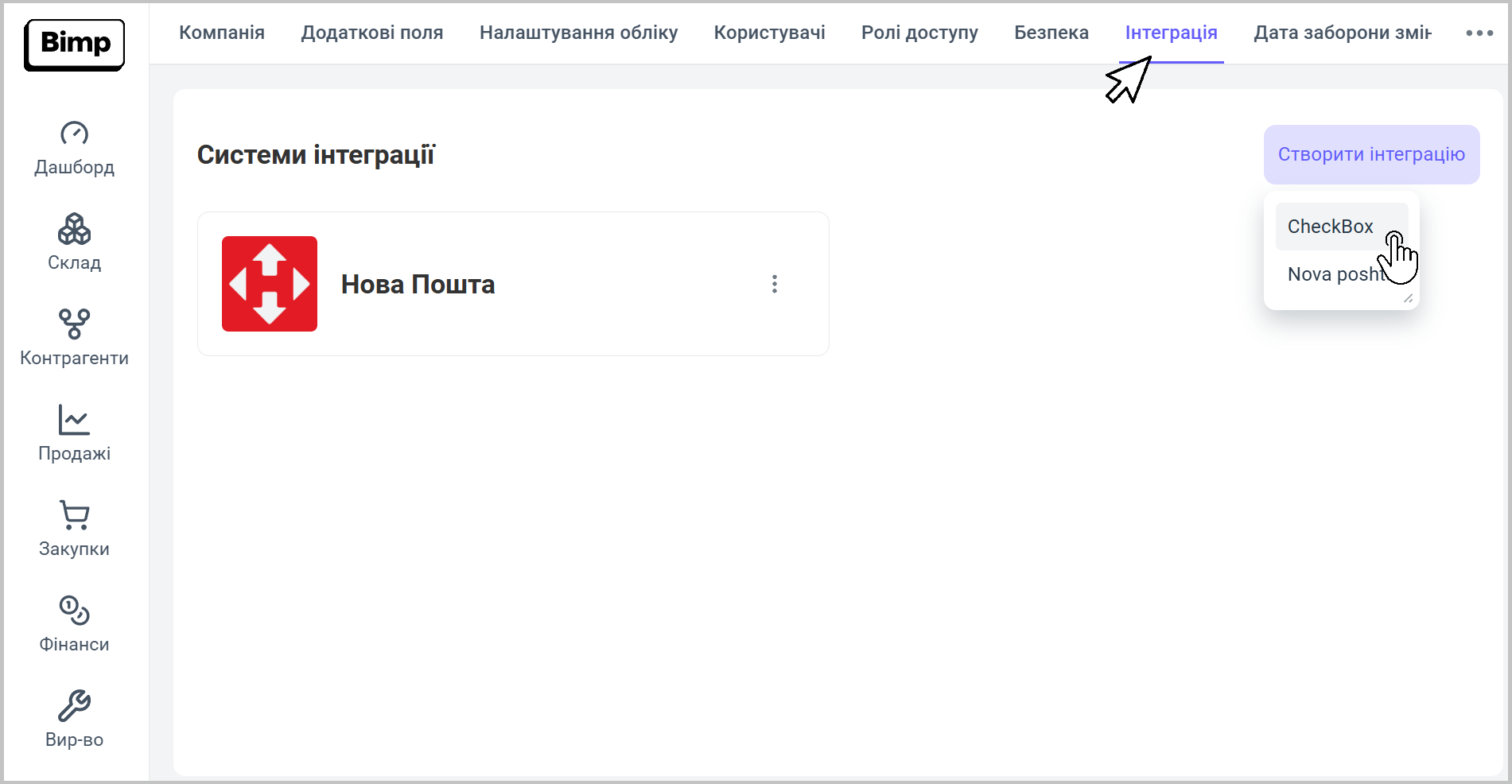 🔹В розділі "Інтеграції" натисніть кнопку "Створити інтеграцію" й оберіть "Сheckbox".