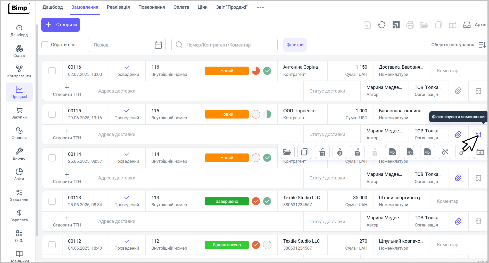 🔹Перейдіть в блок Продажі розділ Замовлення та, оберавши потрібне замовлення, натисніть кнопку "Фіскалізувати замовлення".