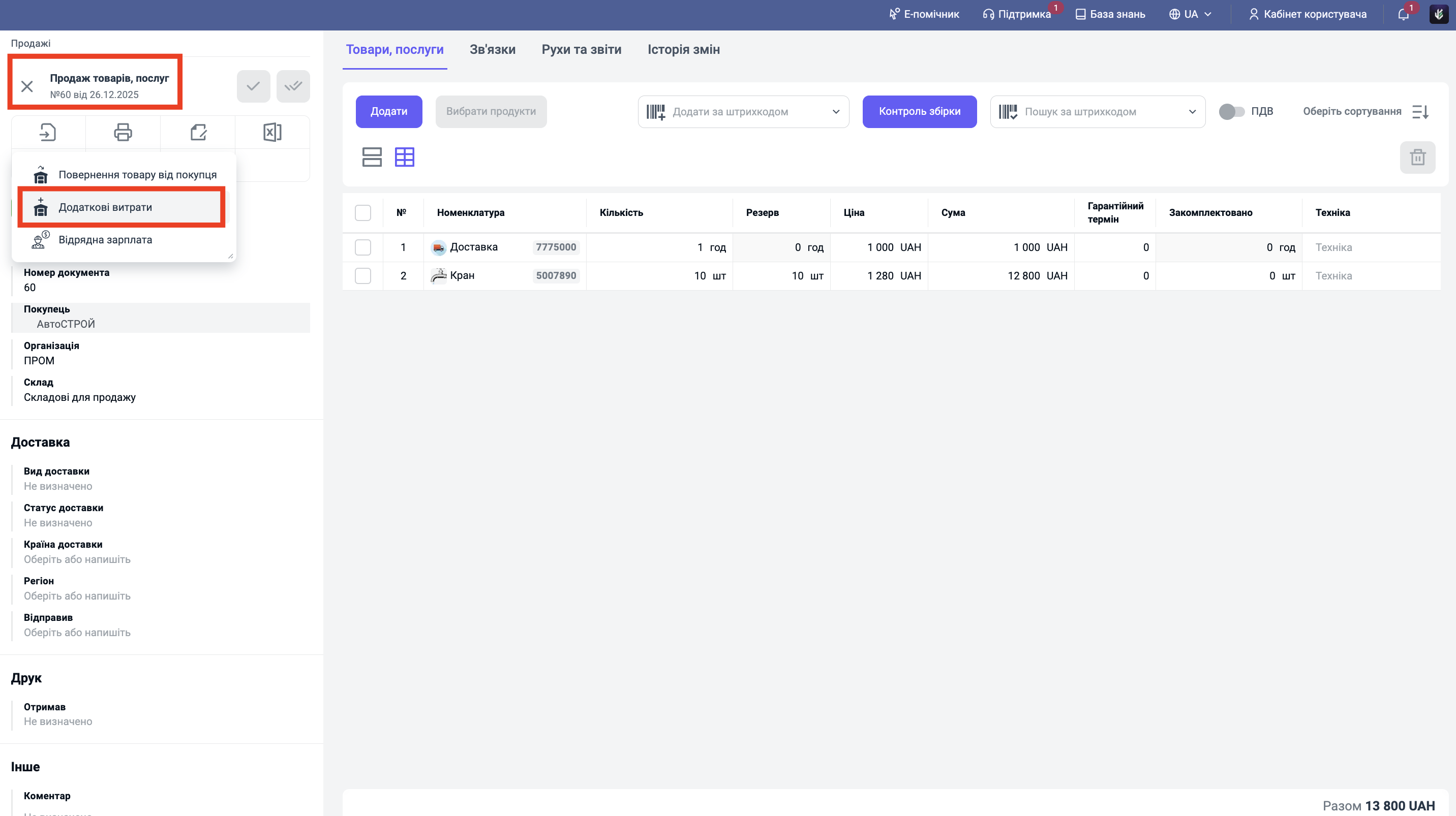 Відкриється документ "Додаткові витрати", в який автоматично підтягнуться всі позиції з продажу.