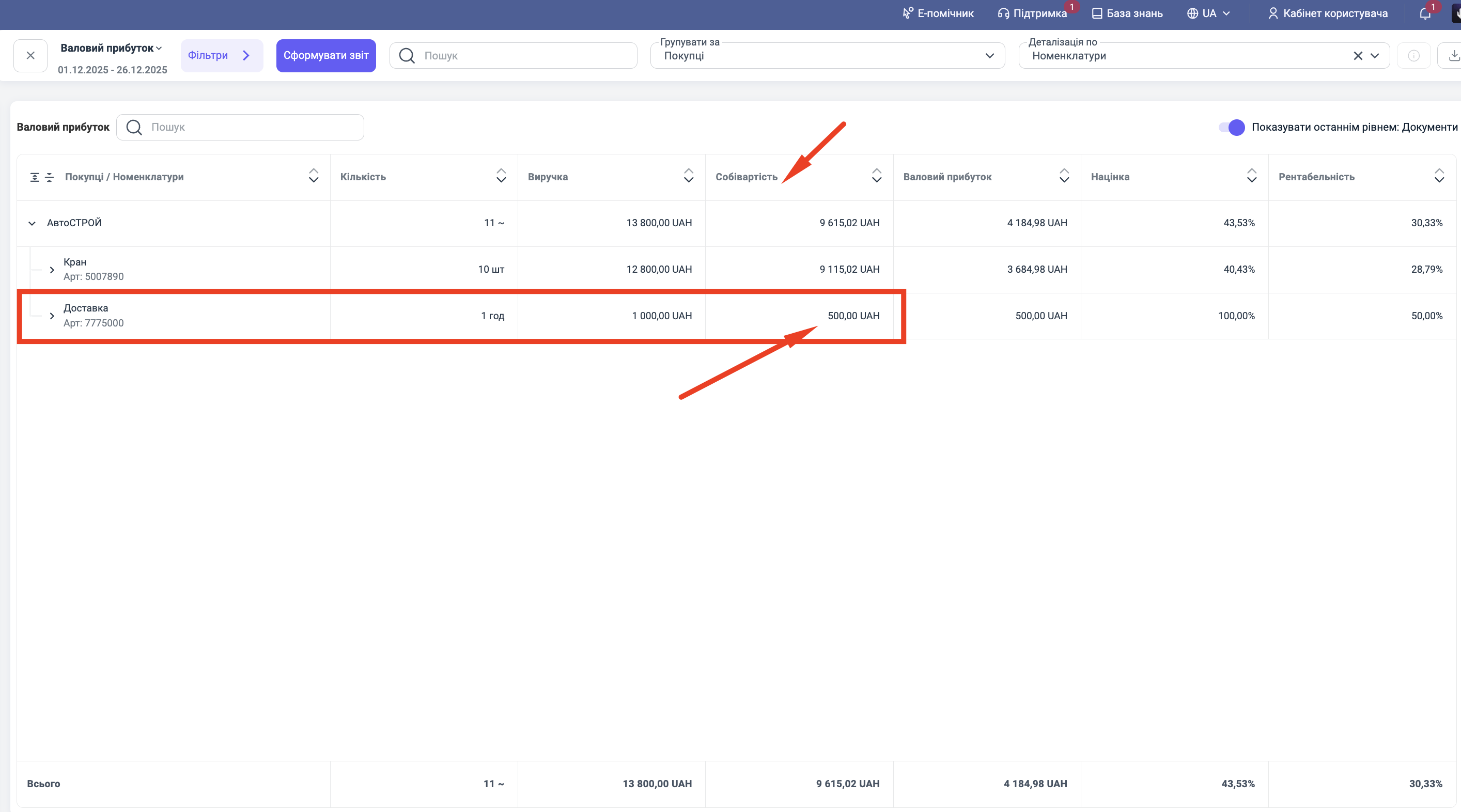 1. Перевіряємо прибуток Перейдіть у звіт "Валовий прибуток". Знайдіть ваш продаж. Тепер у рядку з послугою "Доставка" ви побачите: