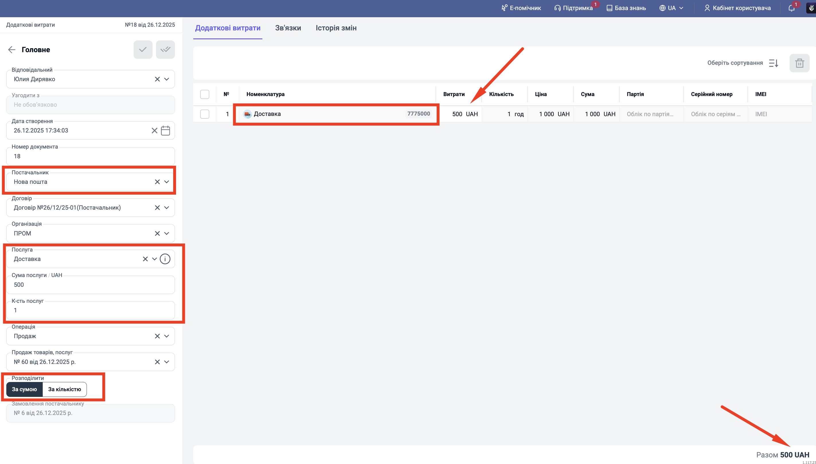 В табличній частині: Залиште тільки ту послугу, на яку треба нарахувати витрати (наприклад, рядок "Доставка"). Зайві товари можна видалити.