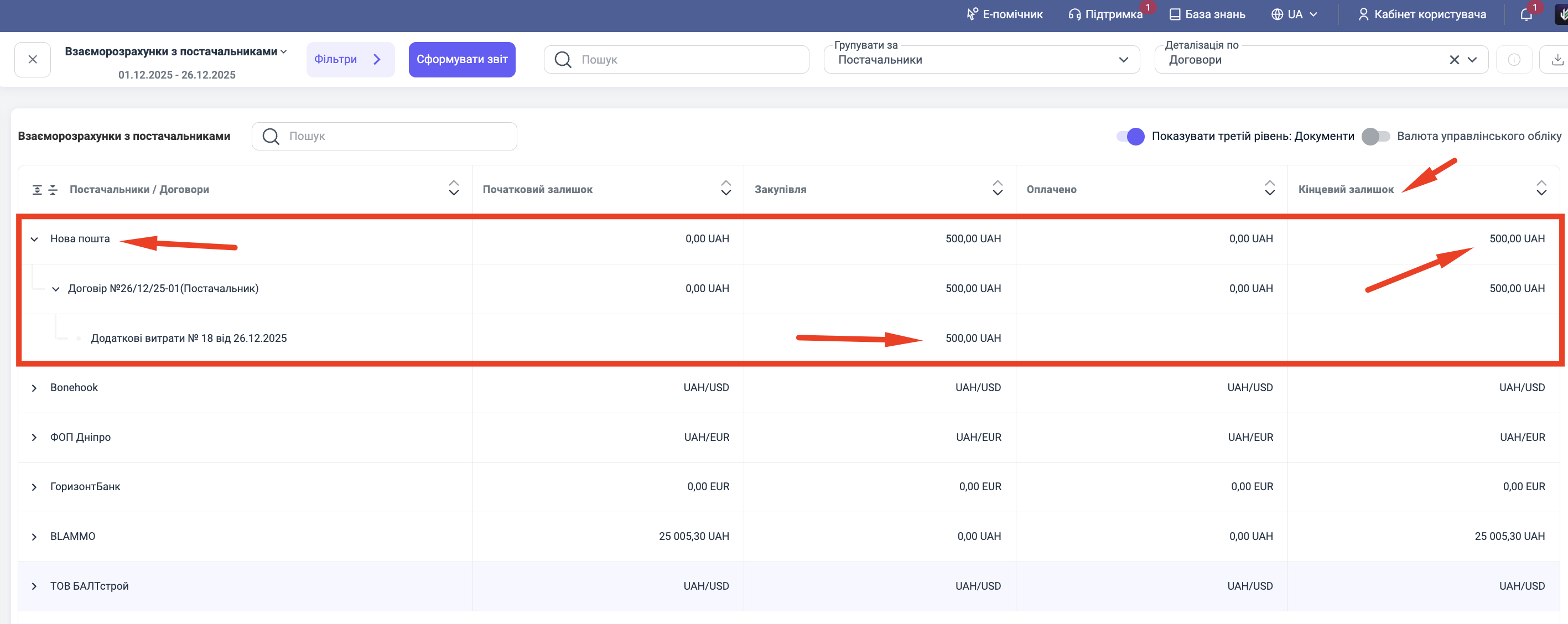- Перевіряємо заборгованість Перейдіть у звіт "Взаєморахунки з постачальниками". Ви побачите, що за контрагентом "Нова Пошта" з'явився борг у розмірі 500 грн на підставі документа "Додаткові витрати".