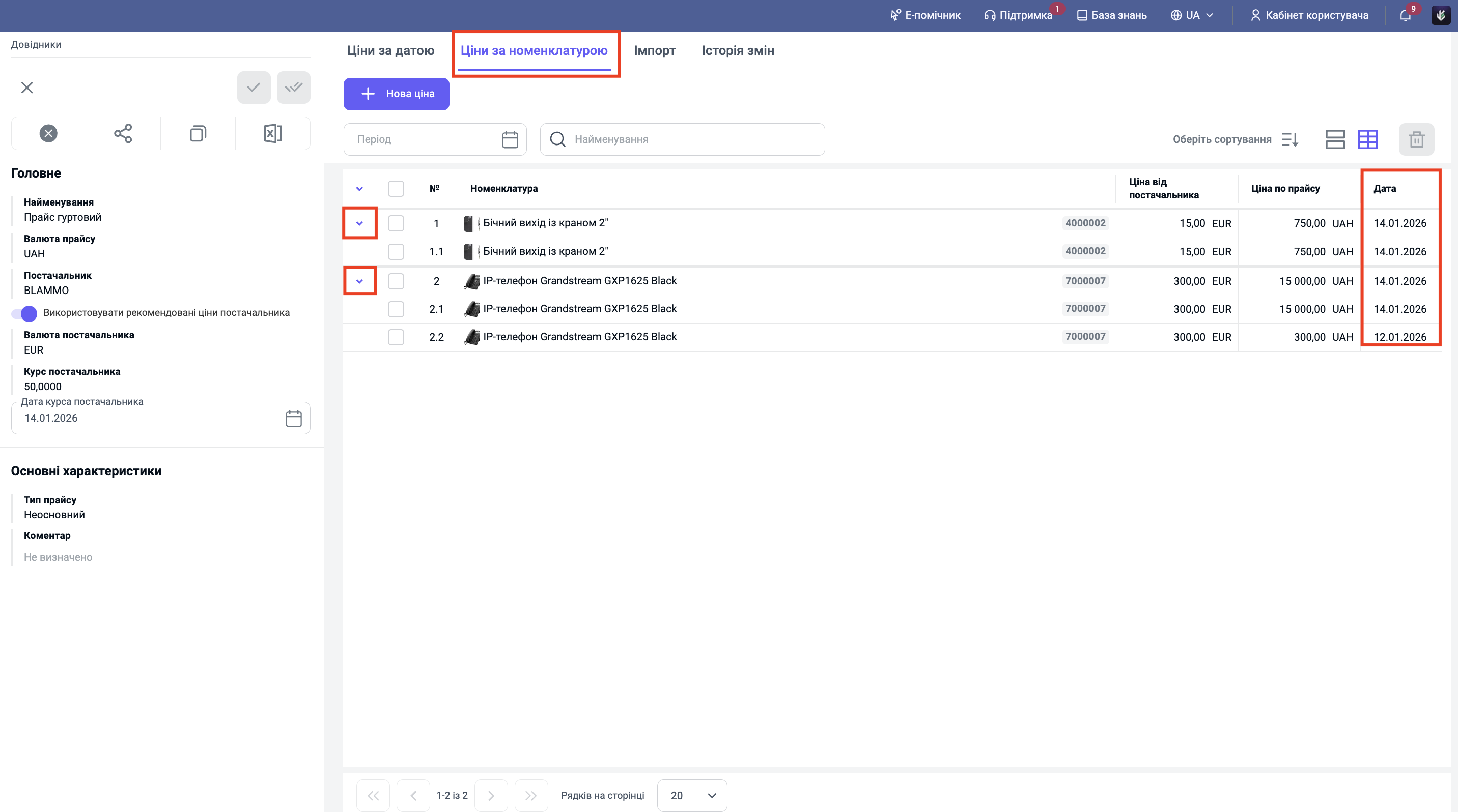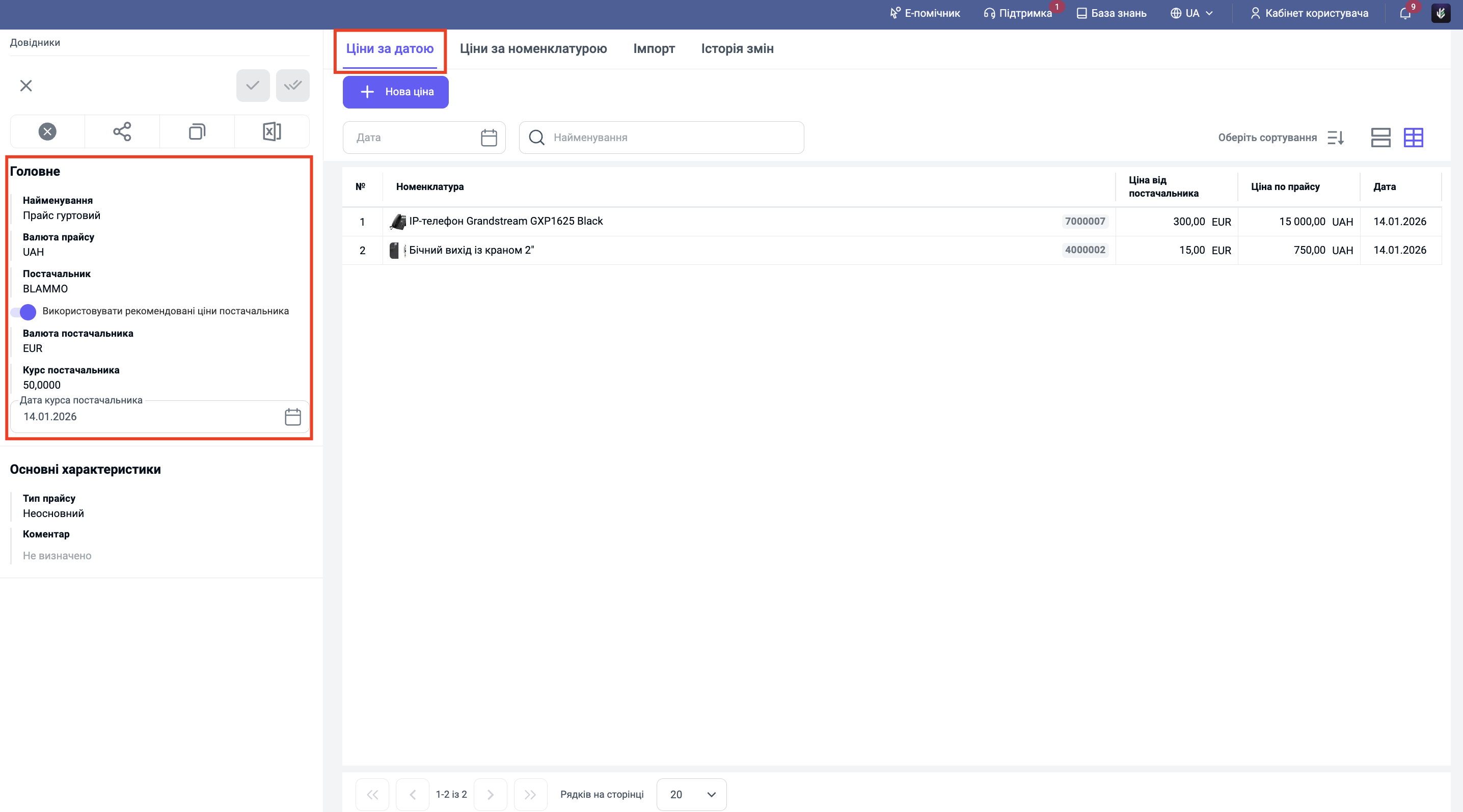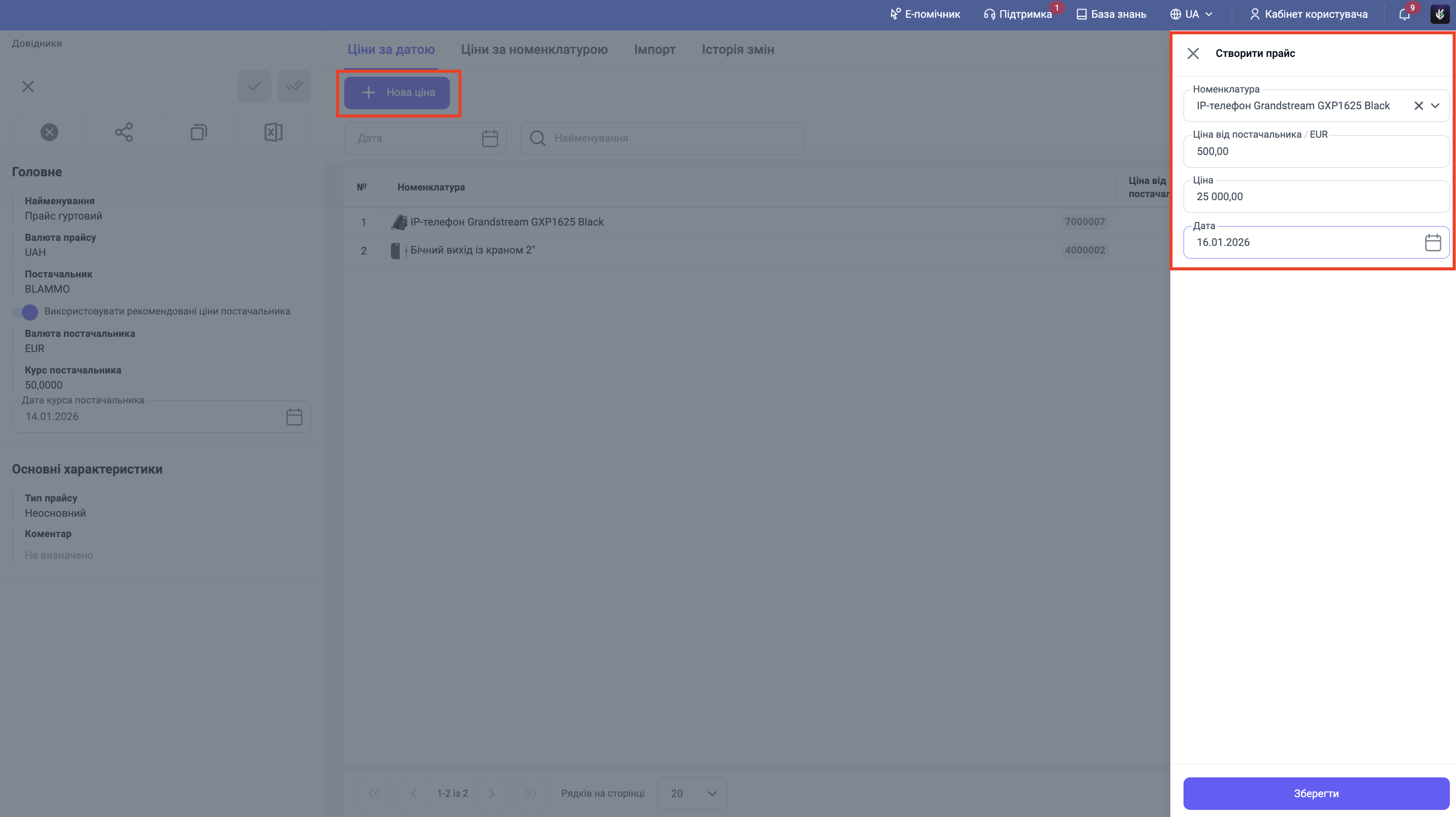 Після збереження відкриються вкладки праворуч. Перейдіть на вкладку "Ціни за датою" або "Ціни за номенклатурою" та натисніть кнопку "+ Нова ціна".