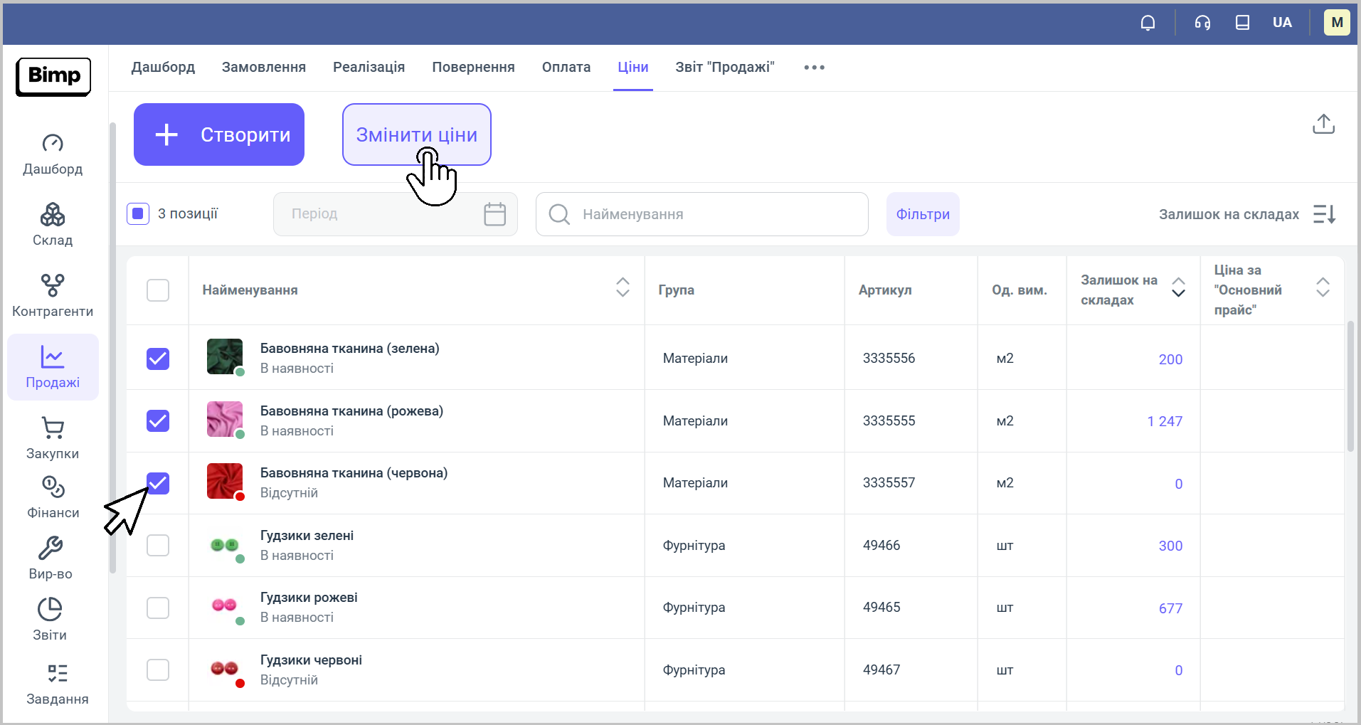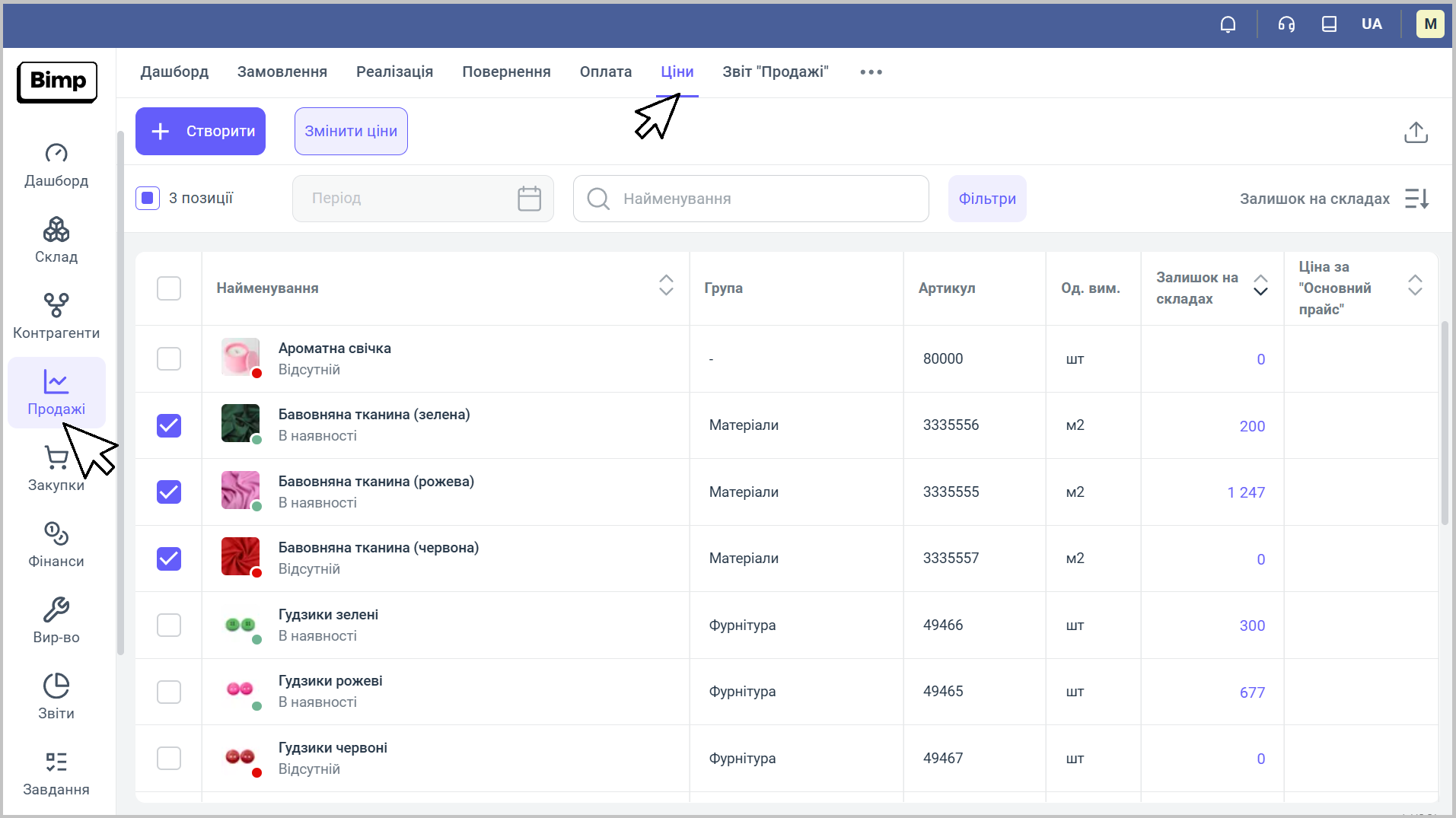 🔹Перейдіть у розділ "Ціни" в модулі "Продажі" та виділіть товари, для яких необхідно змінити ціну.