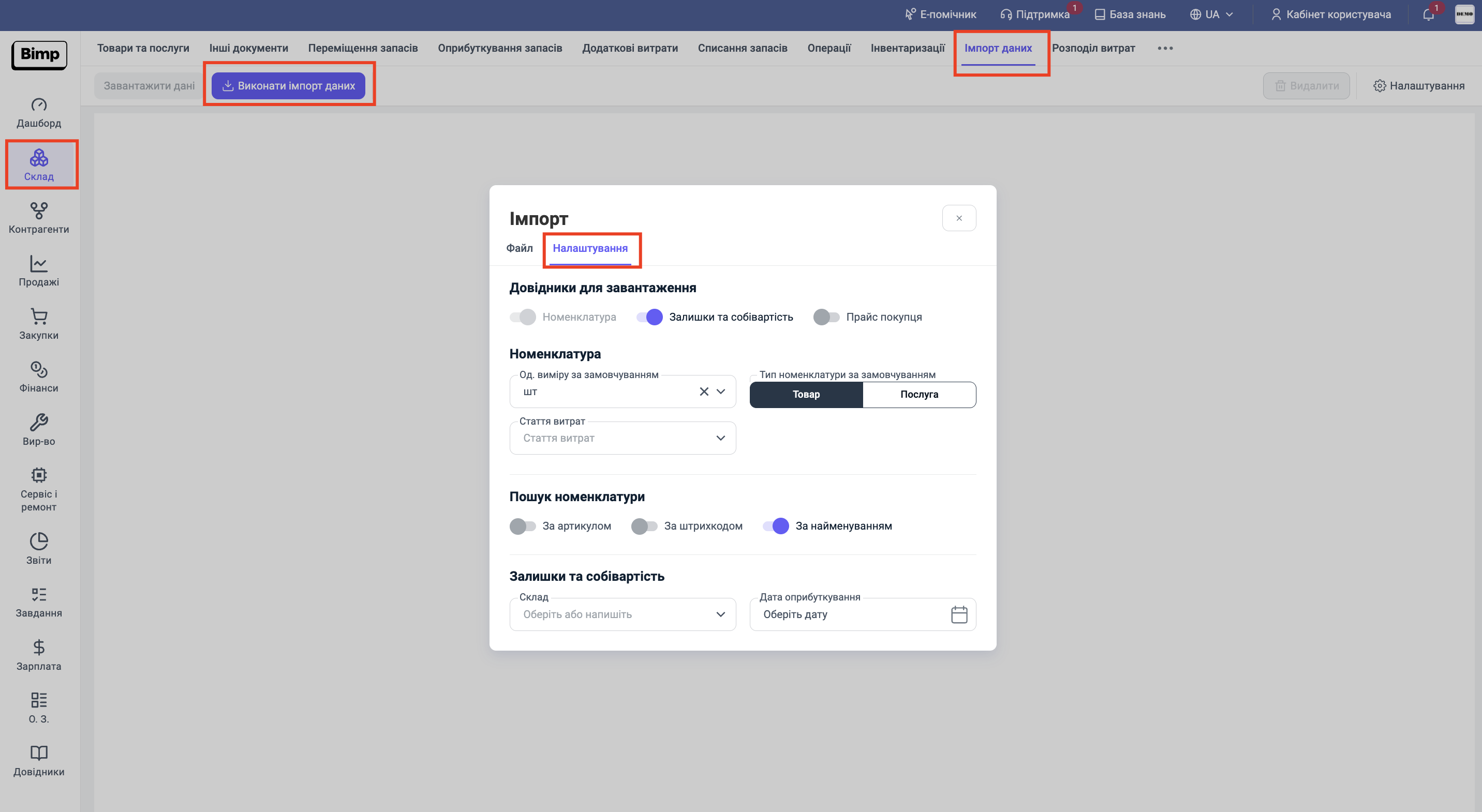 В системі Bimp перейдіть у розділ "Склад", оберіть вкладку "Імпорт даних" та натисніть фіолетову кнопку "Виконати імпорт даних".