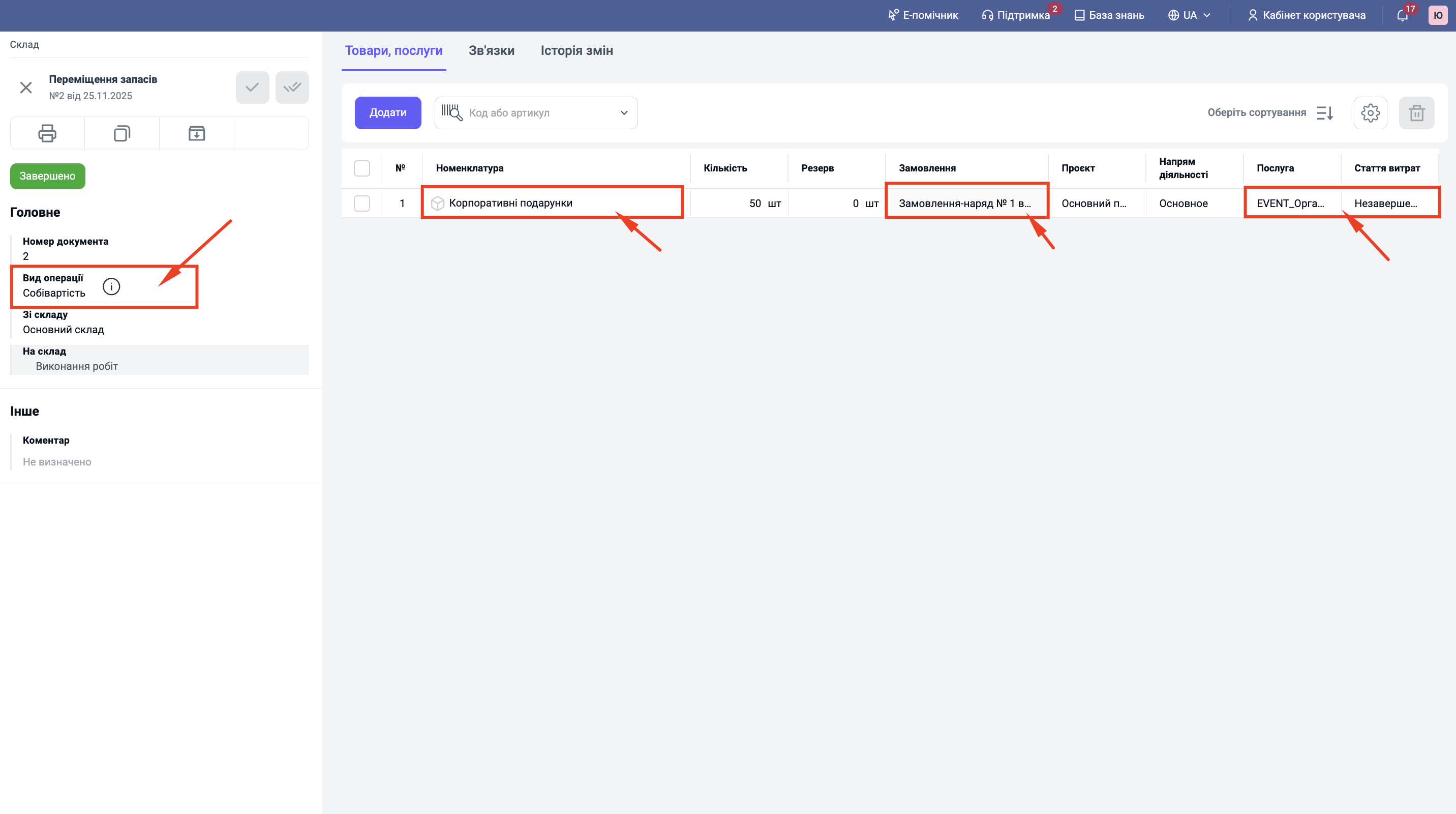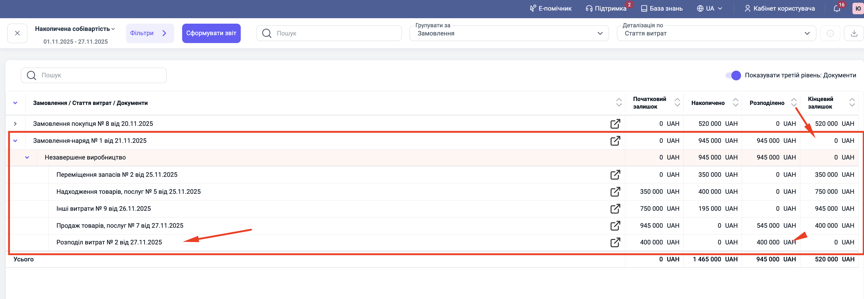 Після збереження документа всі накопичені суми за "Замовленнями-нарядами" (де створено документ "Продажу" та "Розподіл витрат") перейдуть на собівартість послуги.