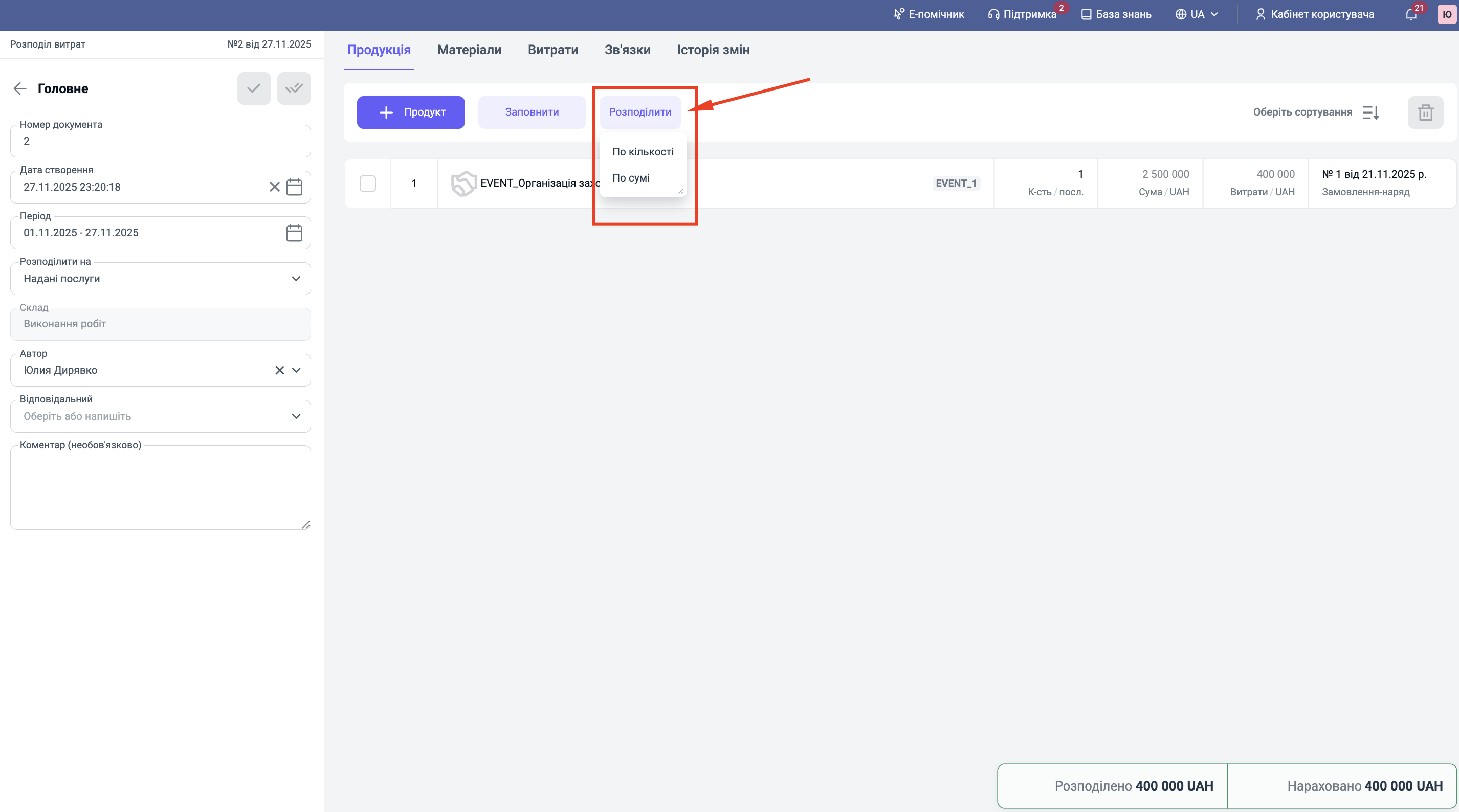Поверніться на вкладку "Продукція" та натисніть "Розподілити". Оберіть варіант розподілу: "По кількості продукції" або "По сумі продукції".