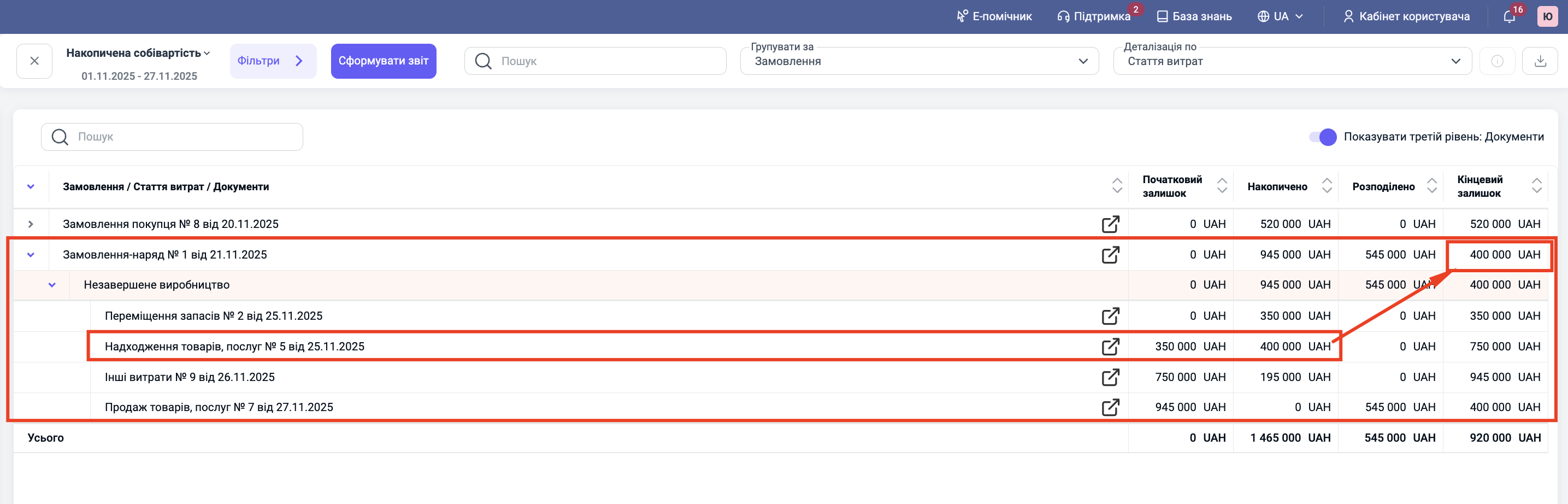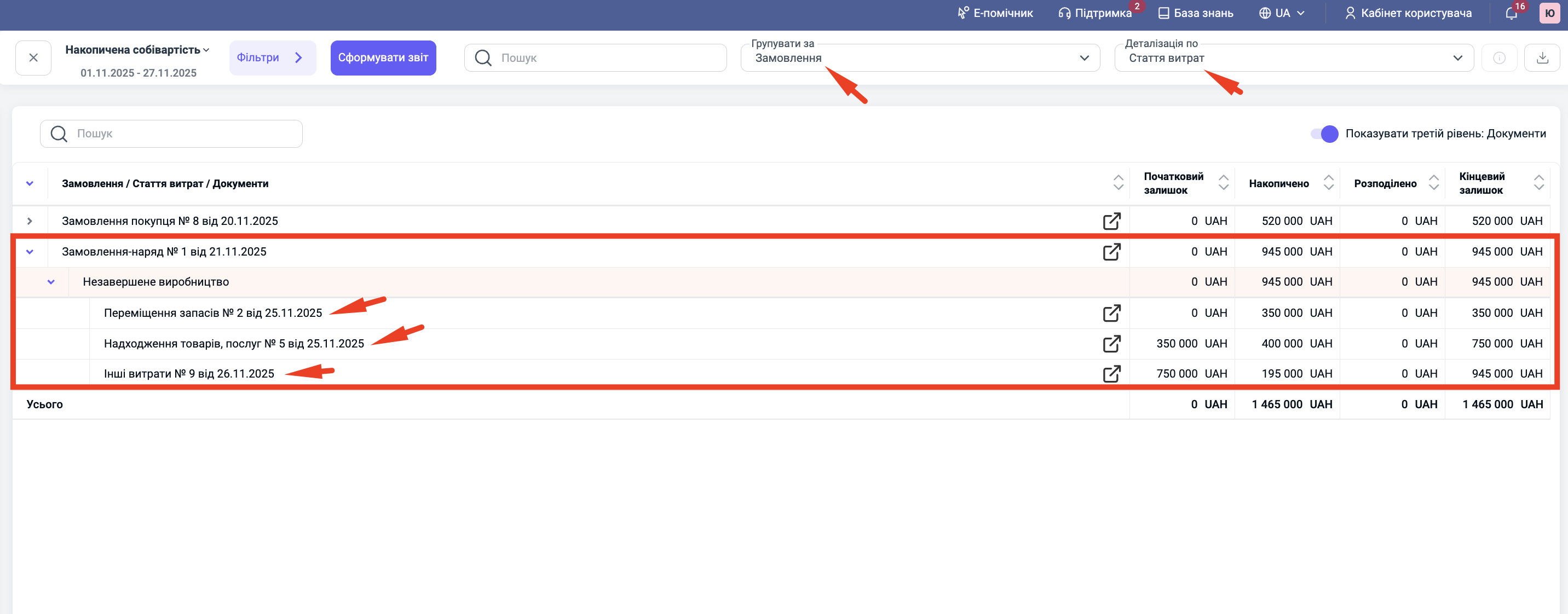 📈 Контроль накопичення: На всіх етапах накопичення витрат (А, Б, В) ви можете перевірити загальну суму накопичених витрат у звіті "Накопичена собівартість"