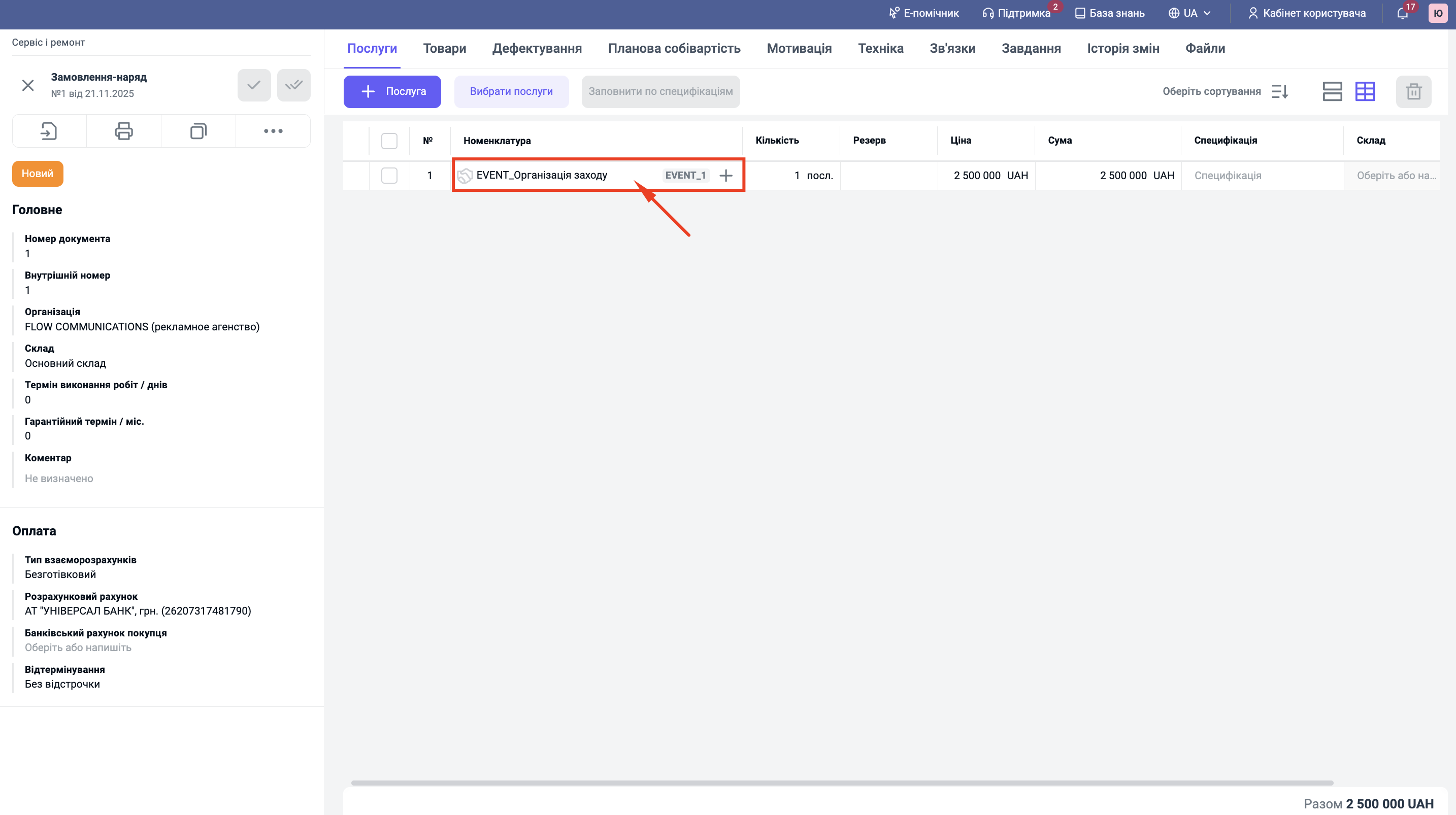 У картці послуги, що відкрилася, заповніть "Найменування" (наприклад, "EVENT_Організація заходу").