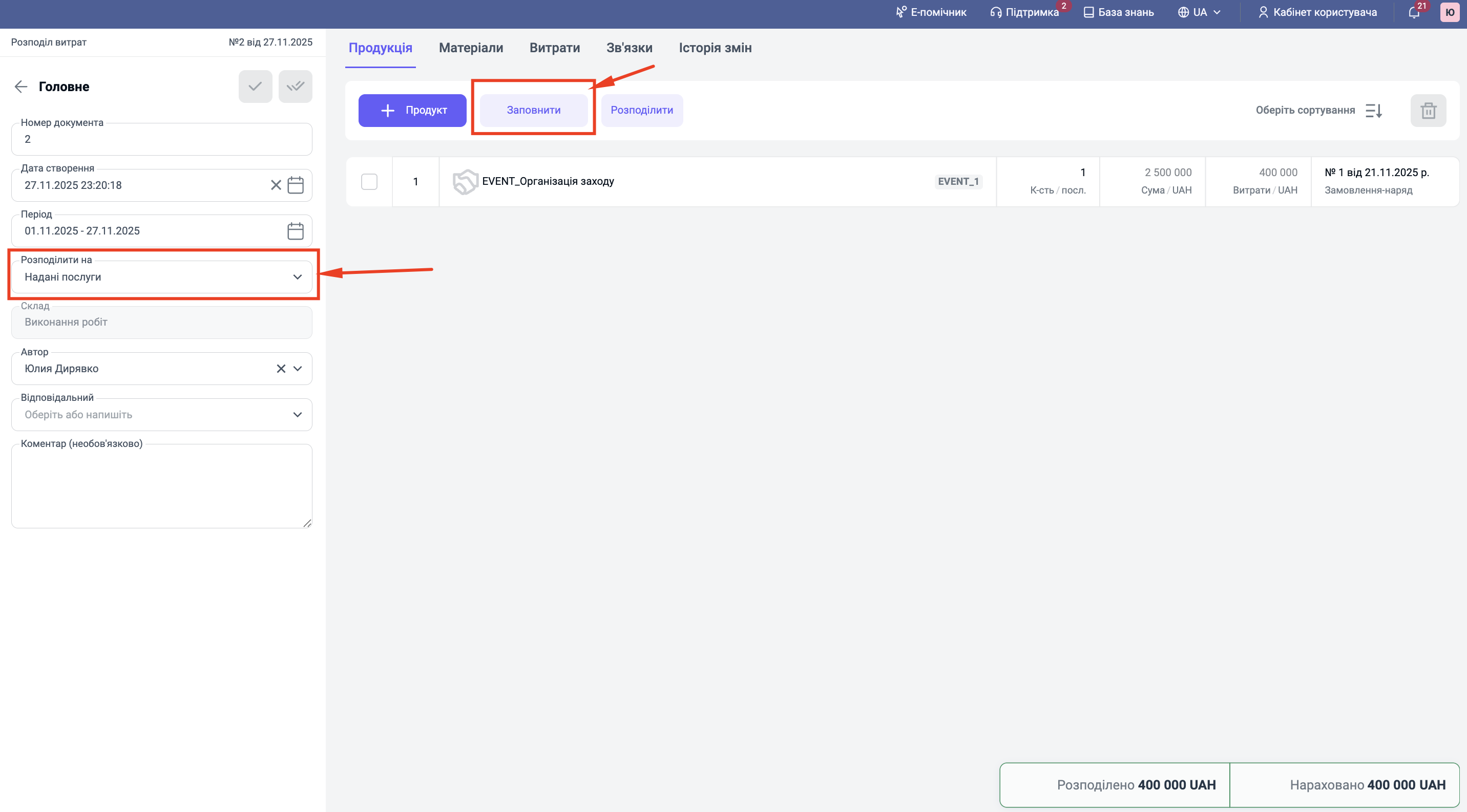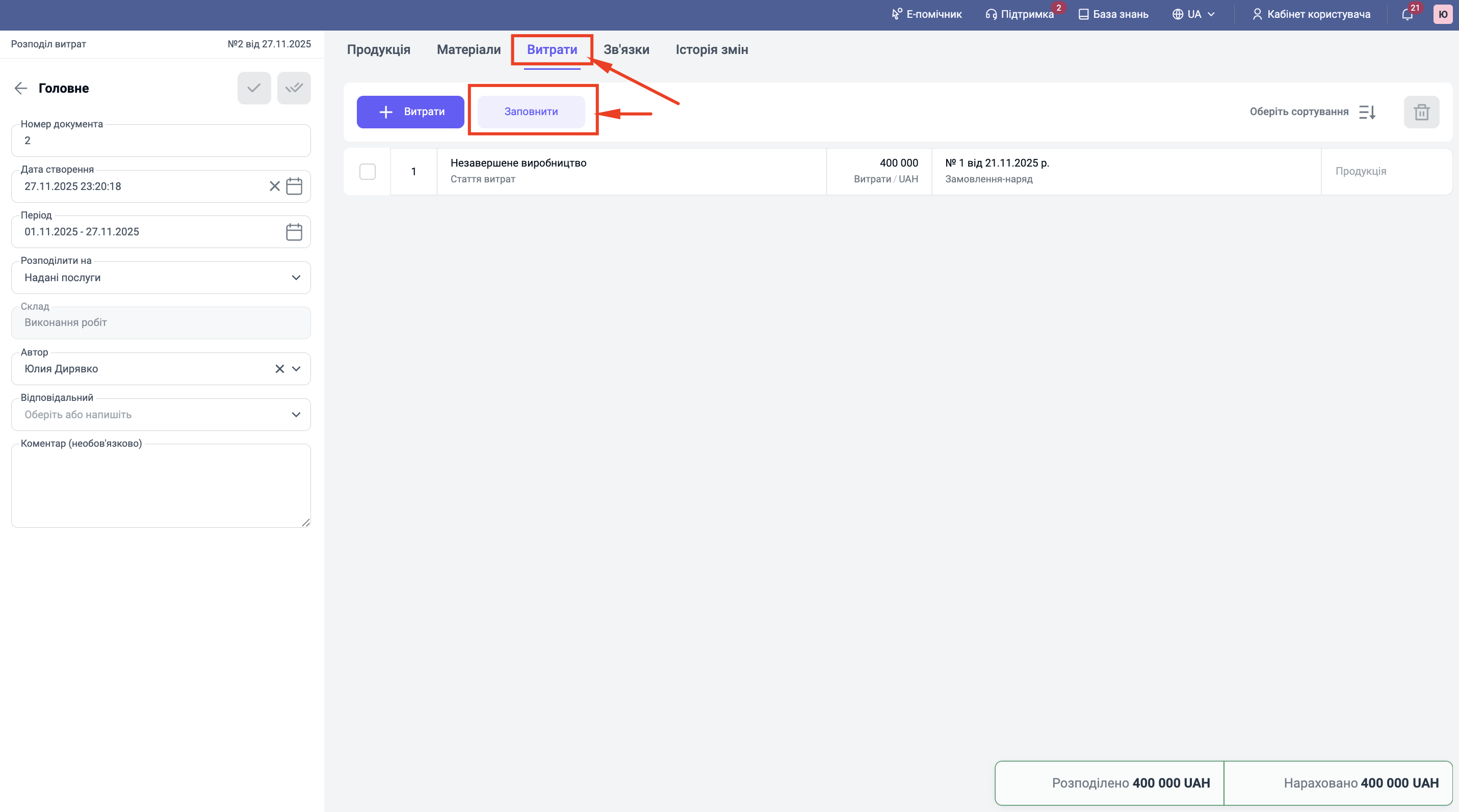 Перейдіть на вкладку "Витрати" та натисніть "Заповнити" – система заповнить усі накопичені витрати, що підлягають розподілу.