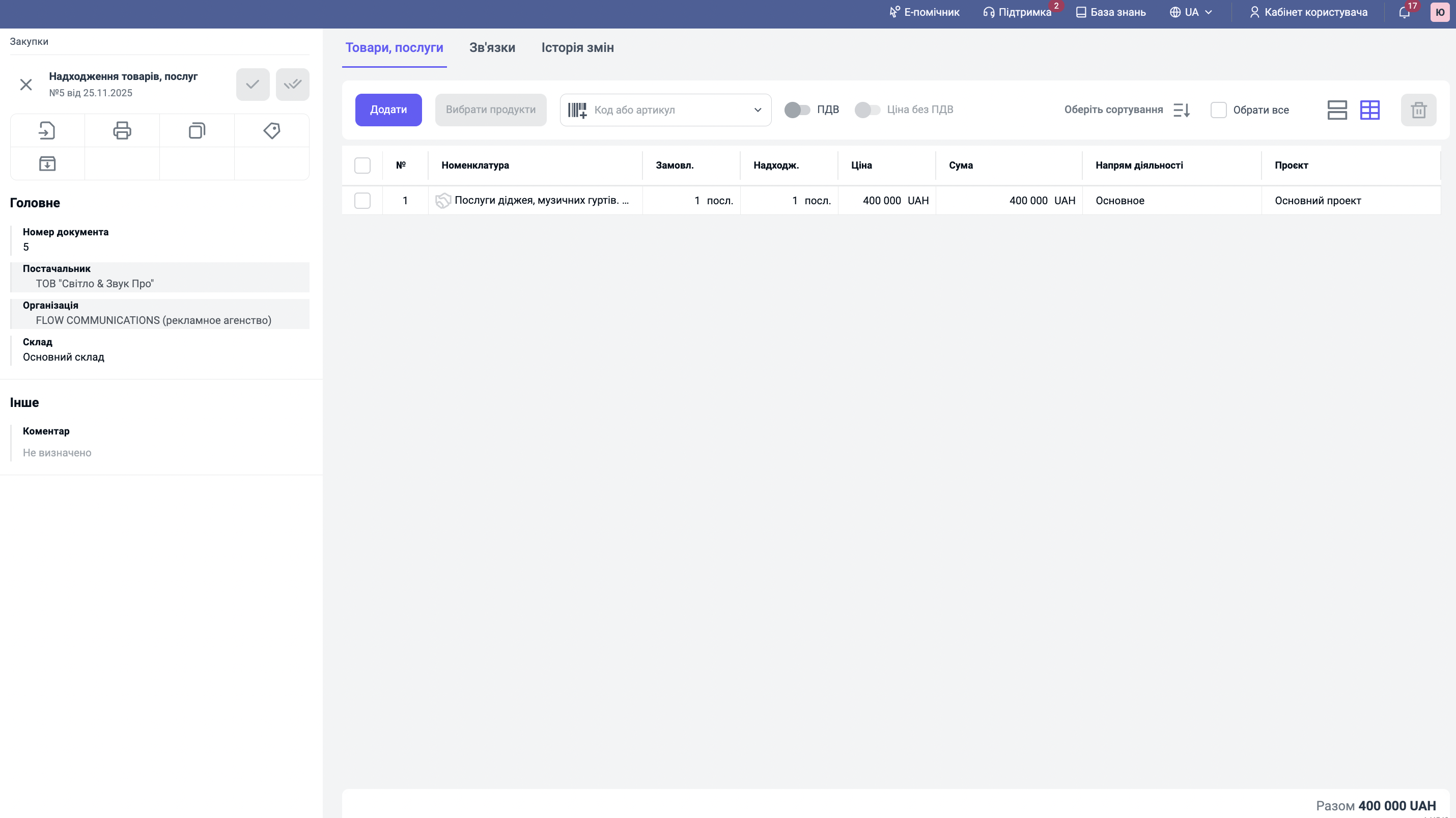 Ця дія збільшує накопичену собівартість на вашій послузі і одночасно нараховує заборгованість перед постачальником.