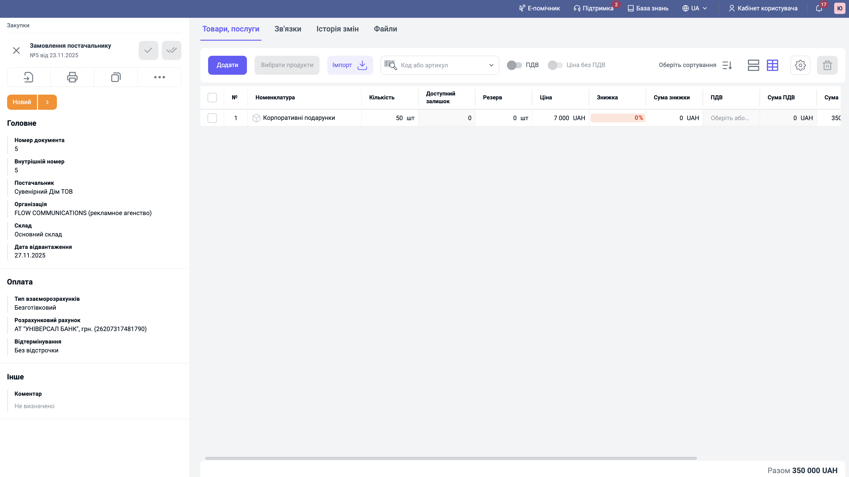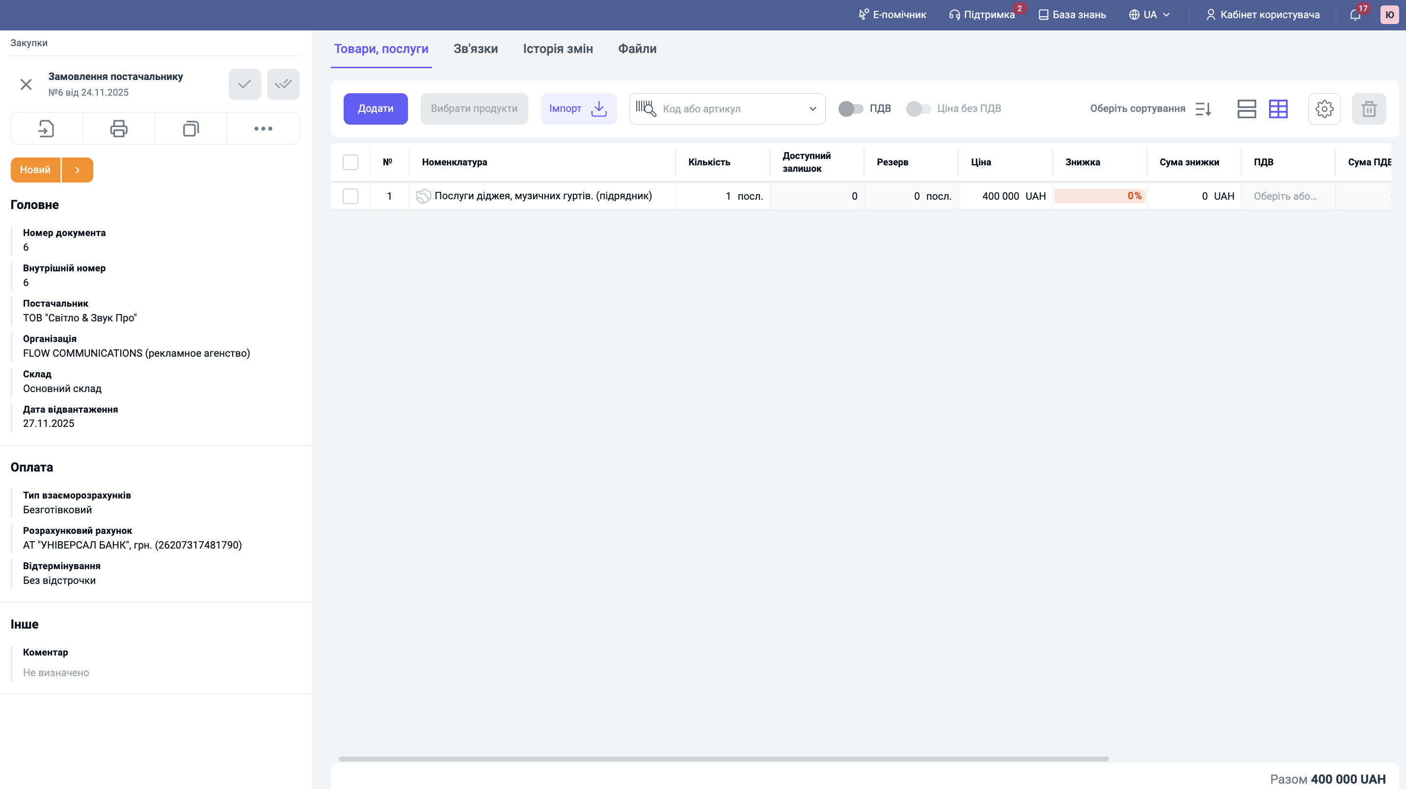 На підставі "Замовлення-наряду" створіть документ "Замовлення постачальнику" на товари/матеріали, які ви купуєте для реалізації послуги