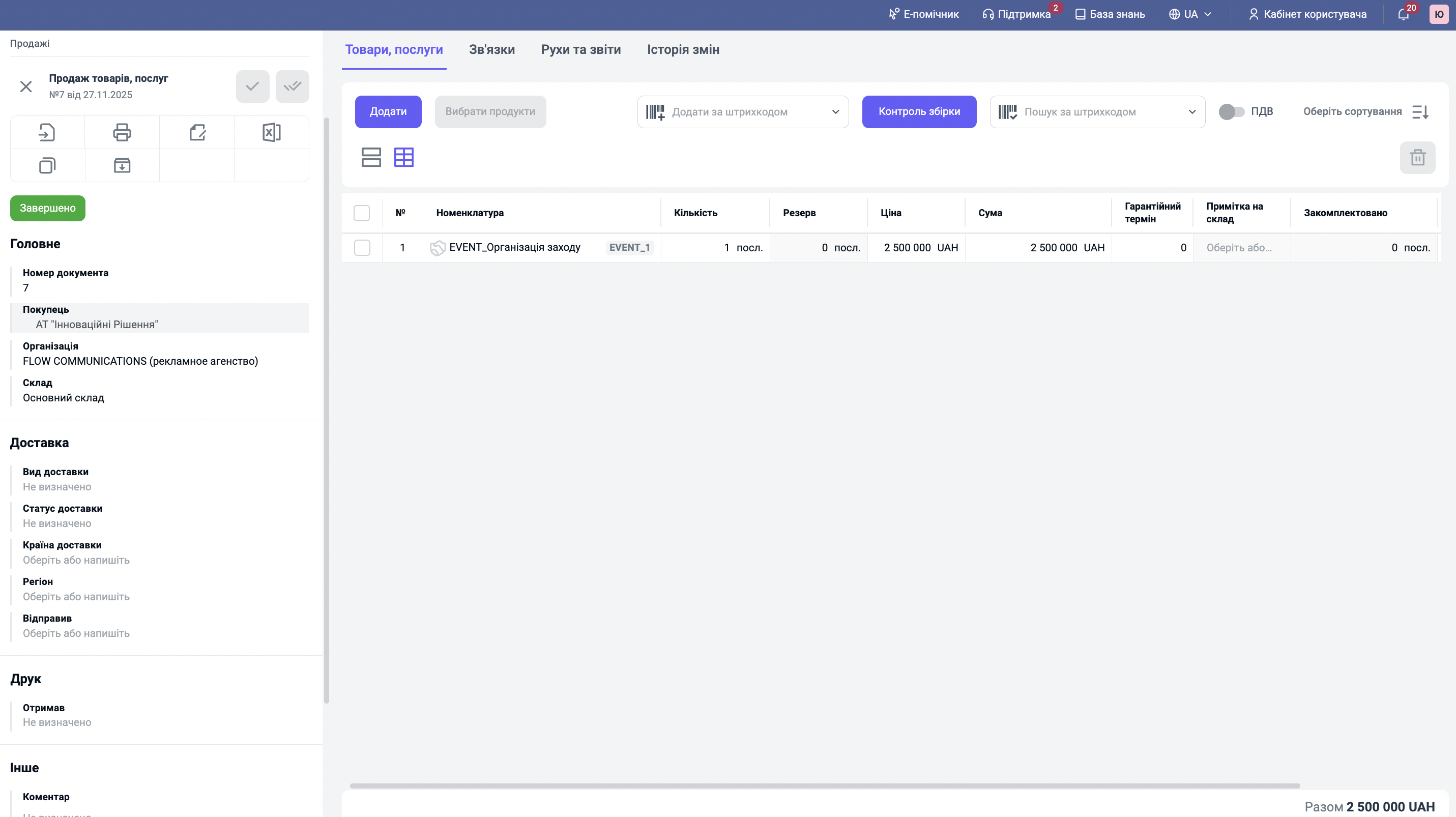 Створіть документ "Продажу" на підставі "Замовлення-наряду".