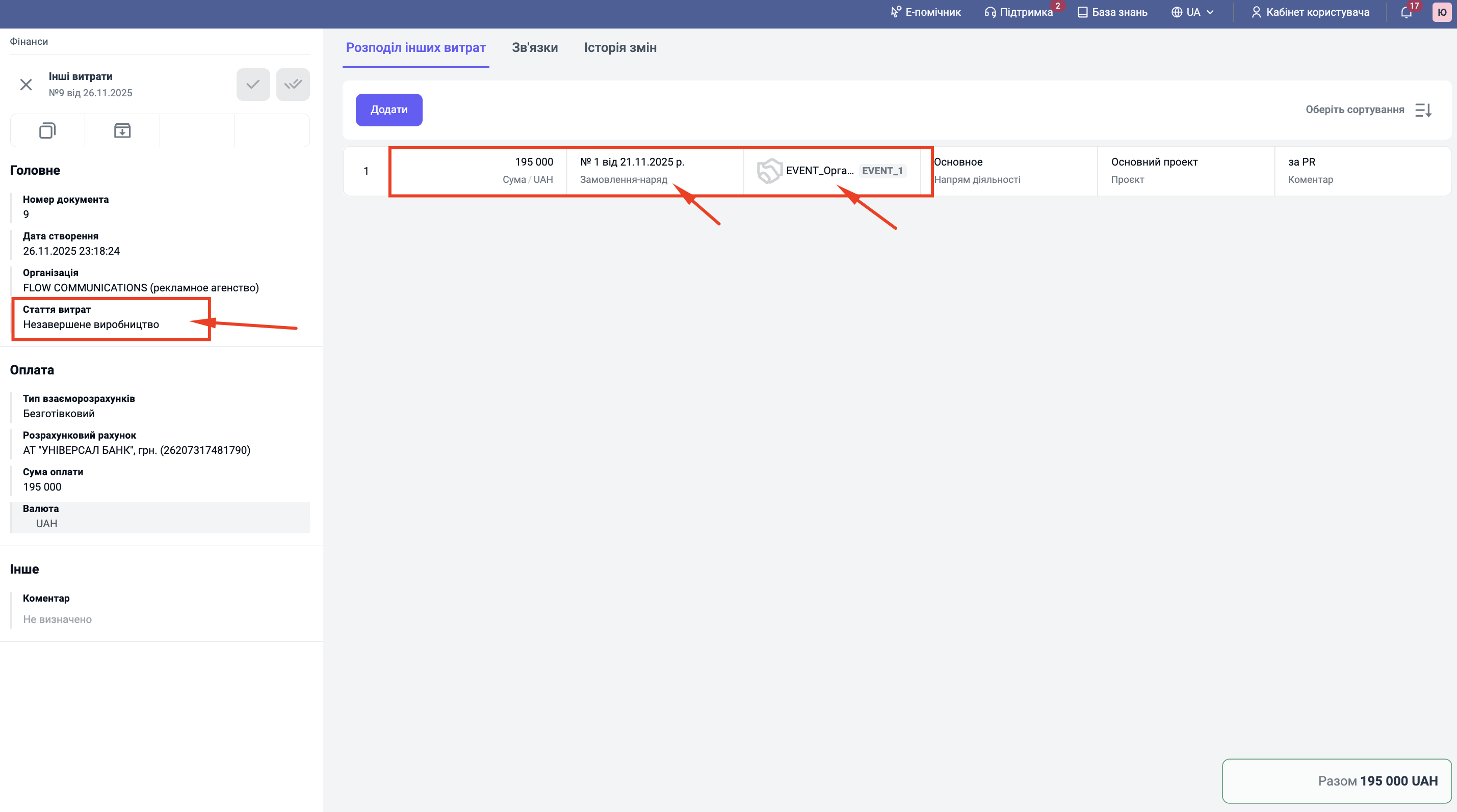 Вкажіть суму витрат, "Документ підстави" (ваш "Замовлення-наряд") і послугу з цього замовлення.