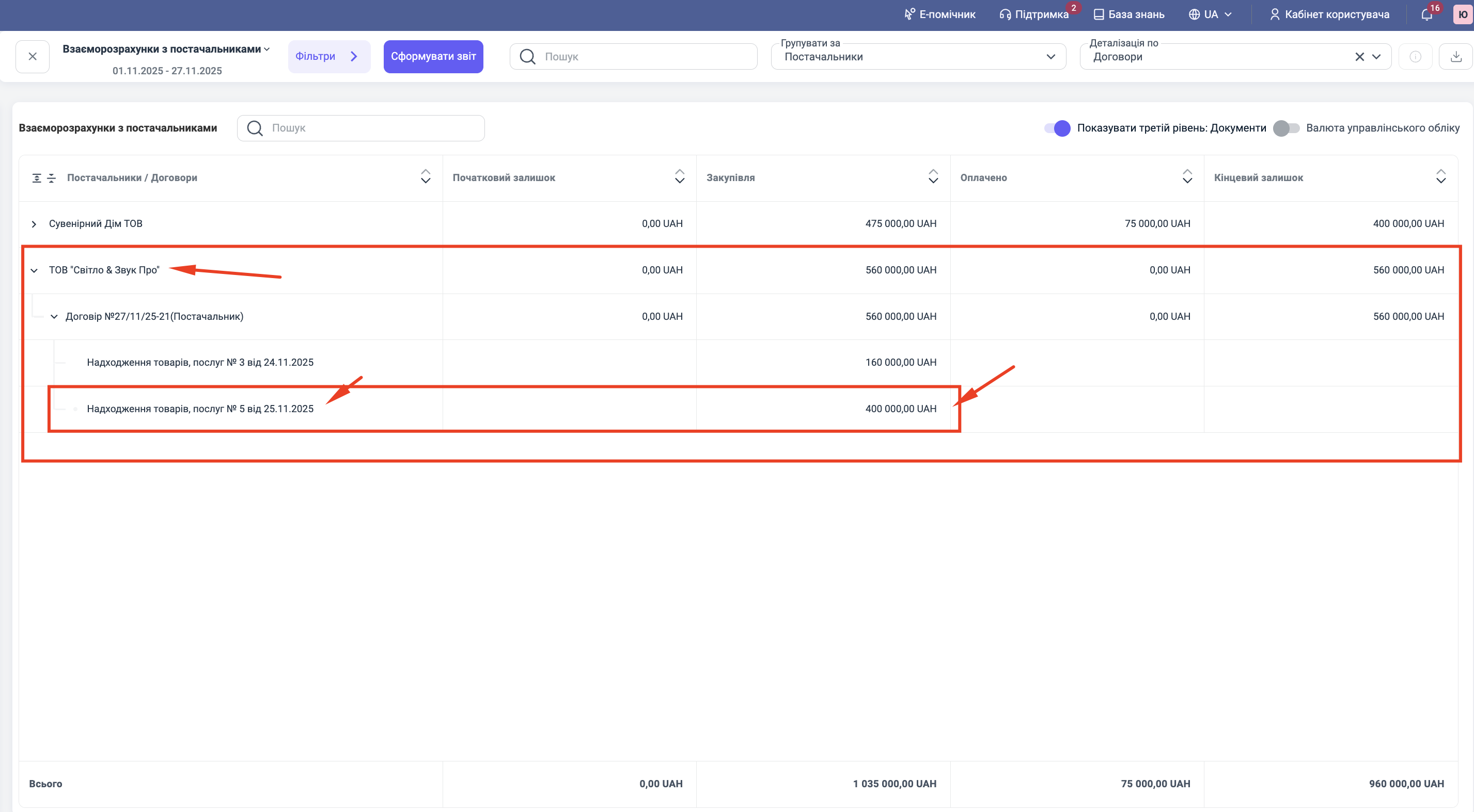 Перевірка заборгованості: Звіт "Взаєморозрахунки з постачальником".
