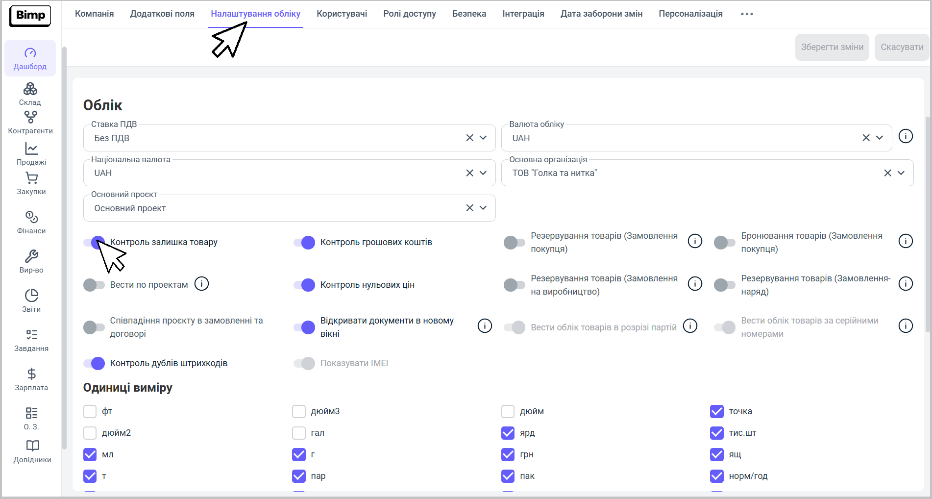 🔹Далі перейдіть у вкладку "Налаштування обліку" та активуйте перемикач "Контроль залишків".