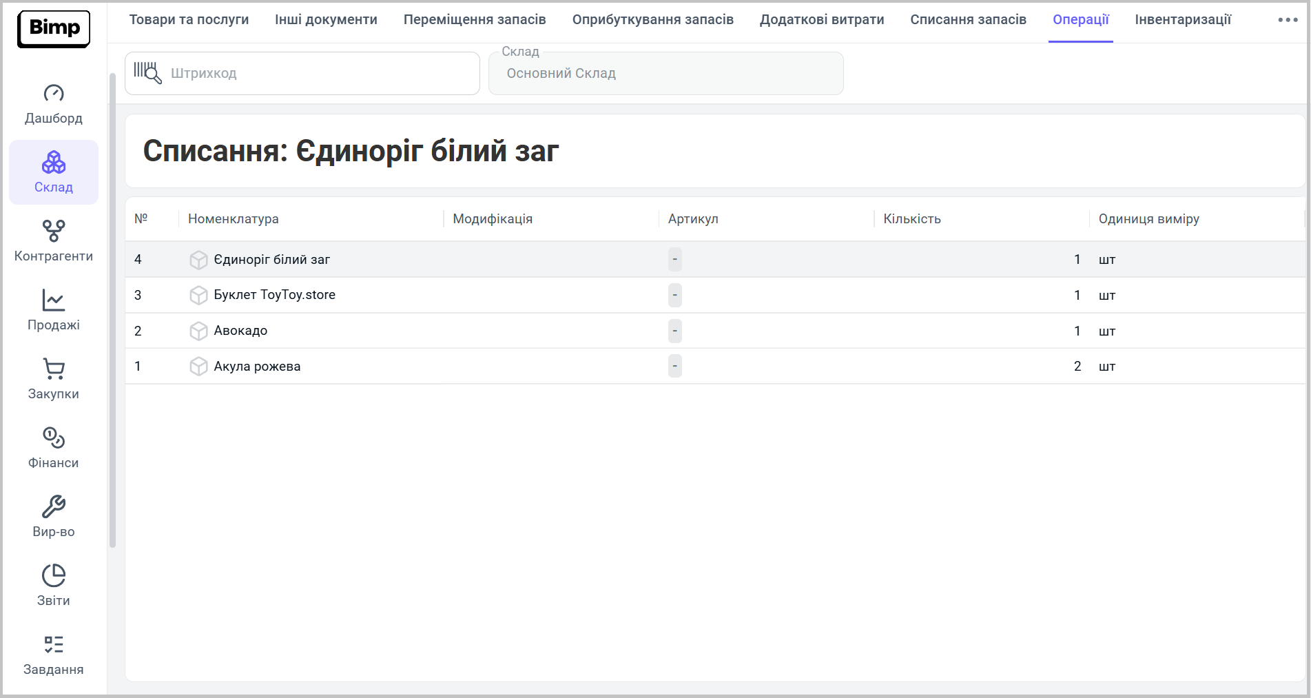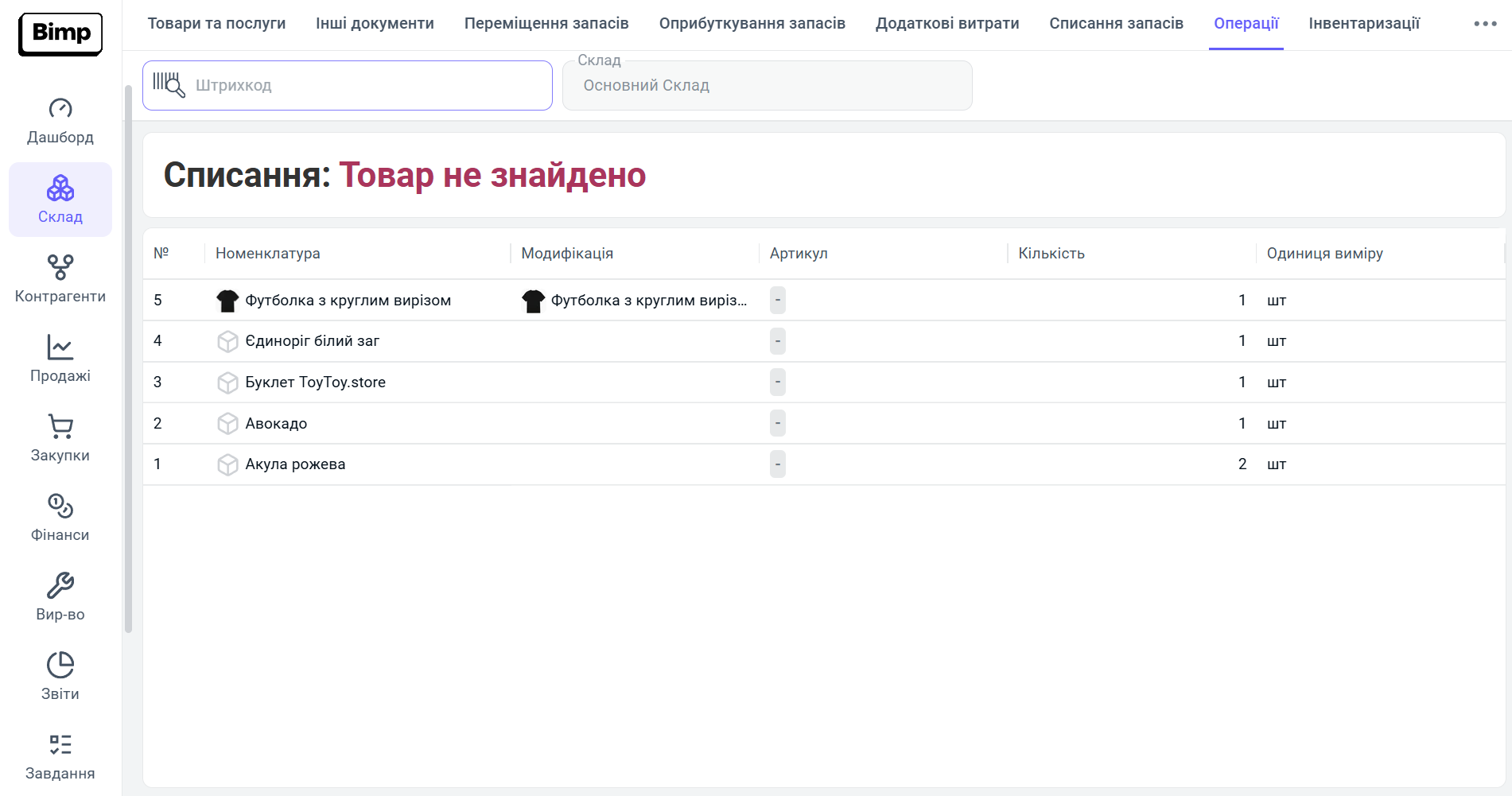 Наприклад: на складі є 3 одиниці, а проскановано 4. У такому разі 3 будуть списані, а ще 1 відобразиться в коментарі як нестача.
