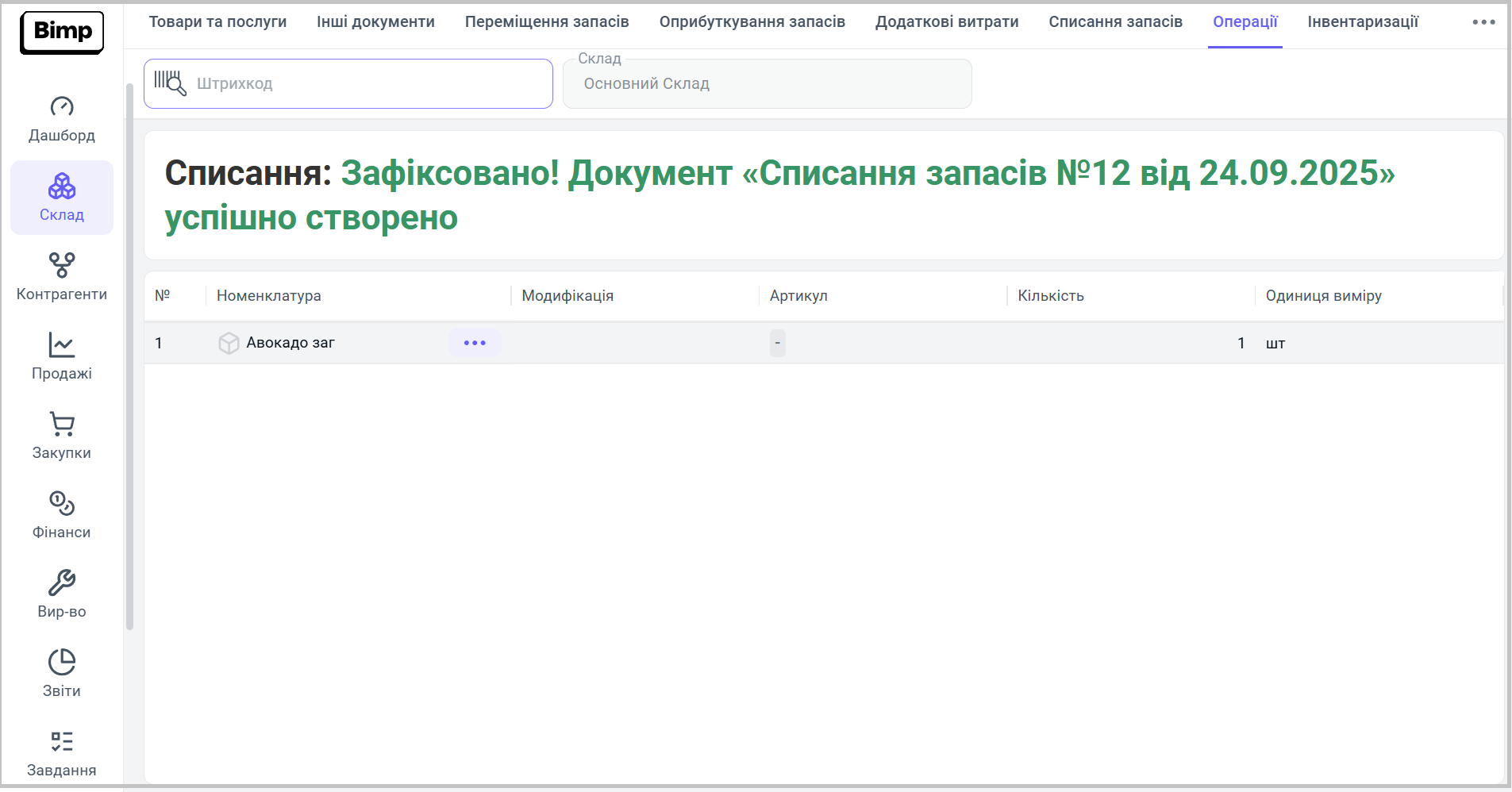 🔹У розділі "Списання запасів" з’явиться новий документ.