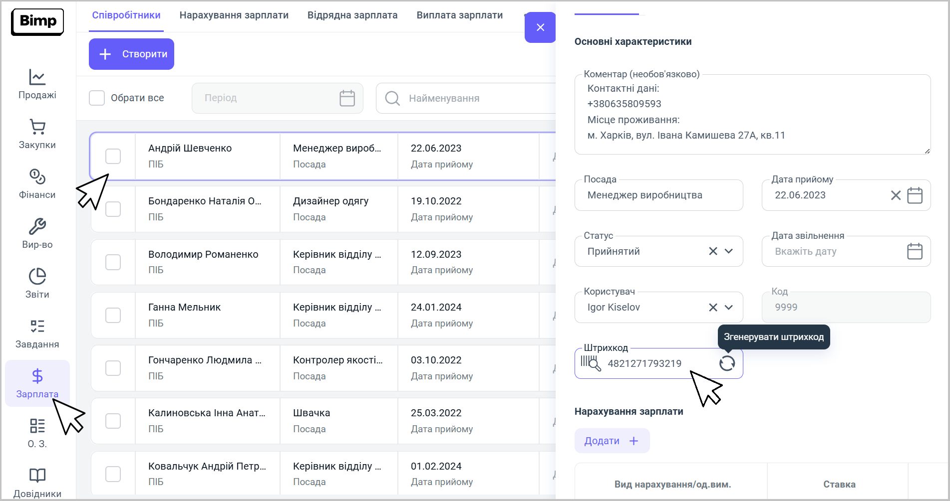🔹У картці співробітника, в розділі "Зарплата" вкажіть "Штрихкод" у відповідному полі. Його можна ввести вручну або згенерувати автоматично за допомогою кнопки.