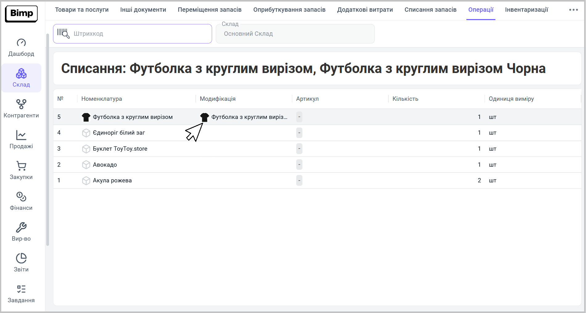 🔹Переходимо в розділ "Склад" та обираємо "Операції". Основний склад підставляється автоматично.
