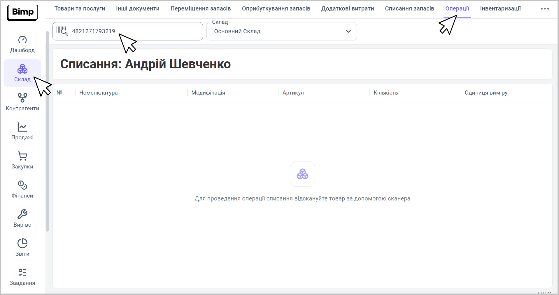 🔹 Щоб завершити сесію, повторно скануйте штрихкод співробітника. Після цього буде створено документ "Списання товарів".