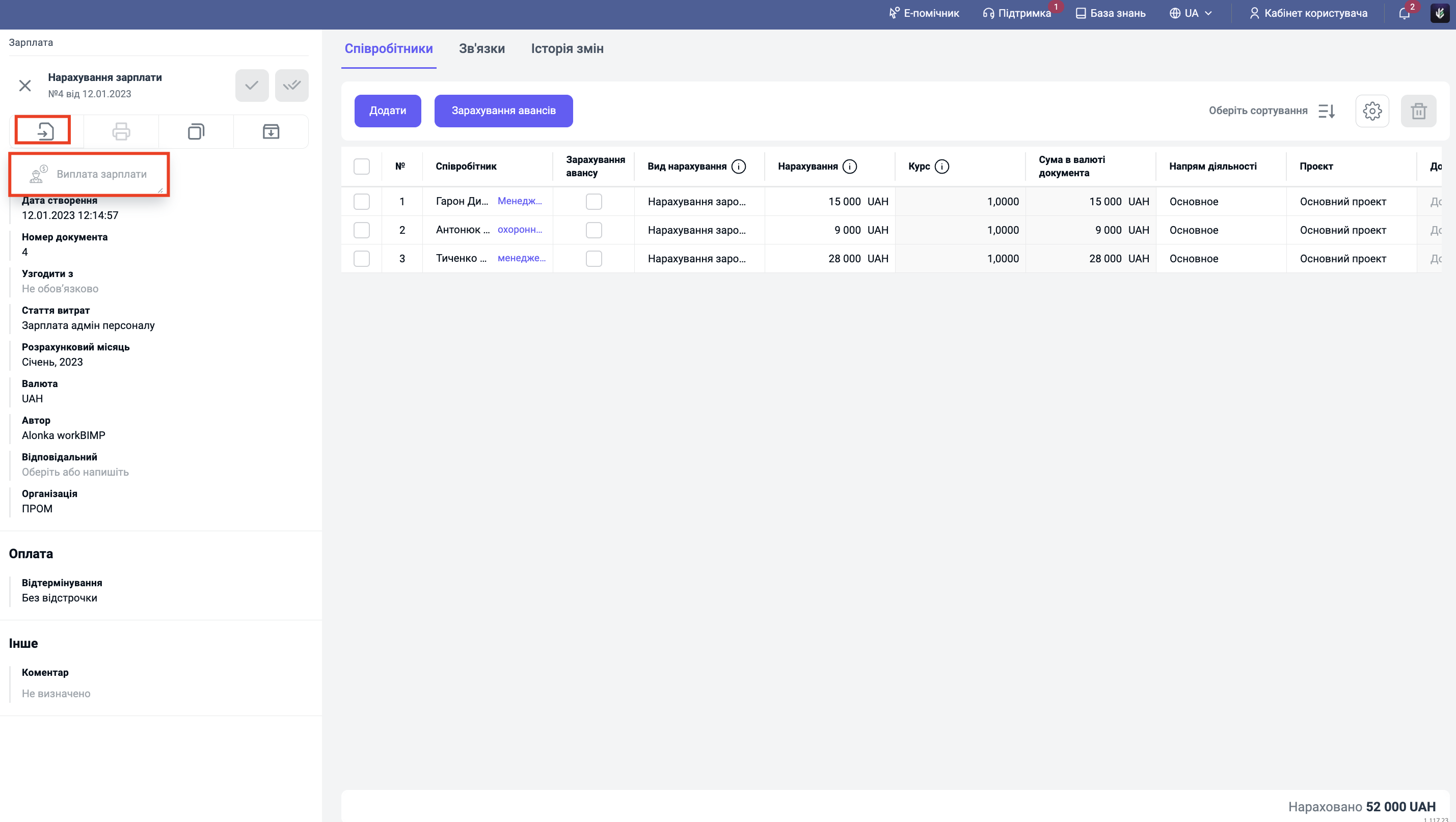 Оберіть "Виплата зарплати". Система створить платіжний документ на основі цього нарахування.