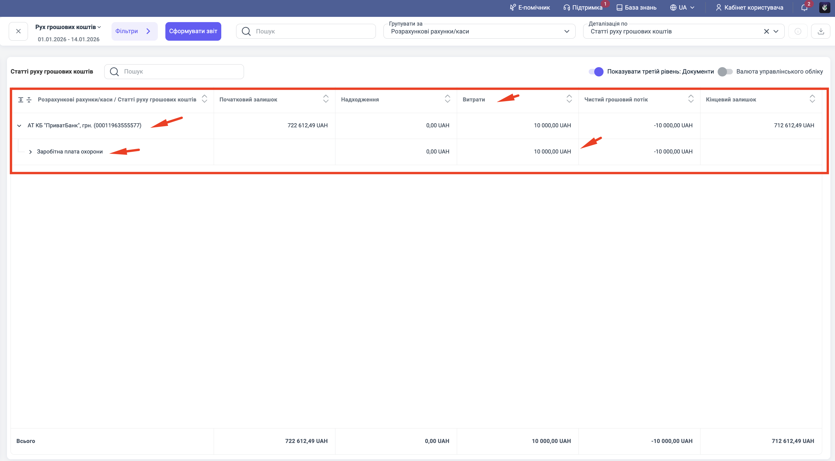 Звіт "Рух грошей" (Cash Flow): Тут ви побачите зменшення залишку на рахунку/в касі на суму виплати.