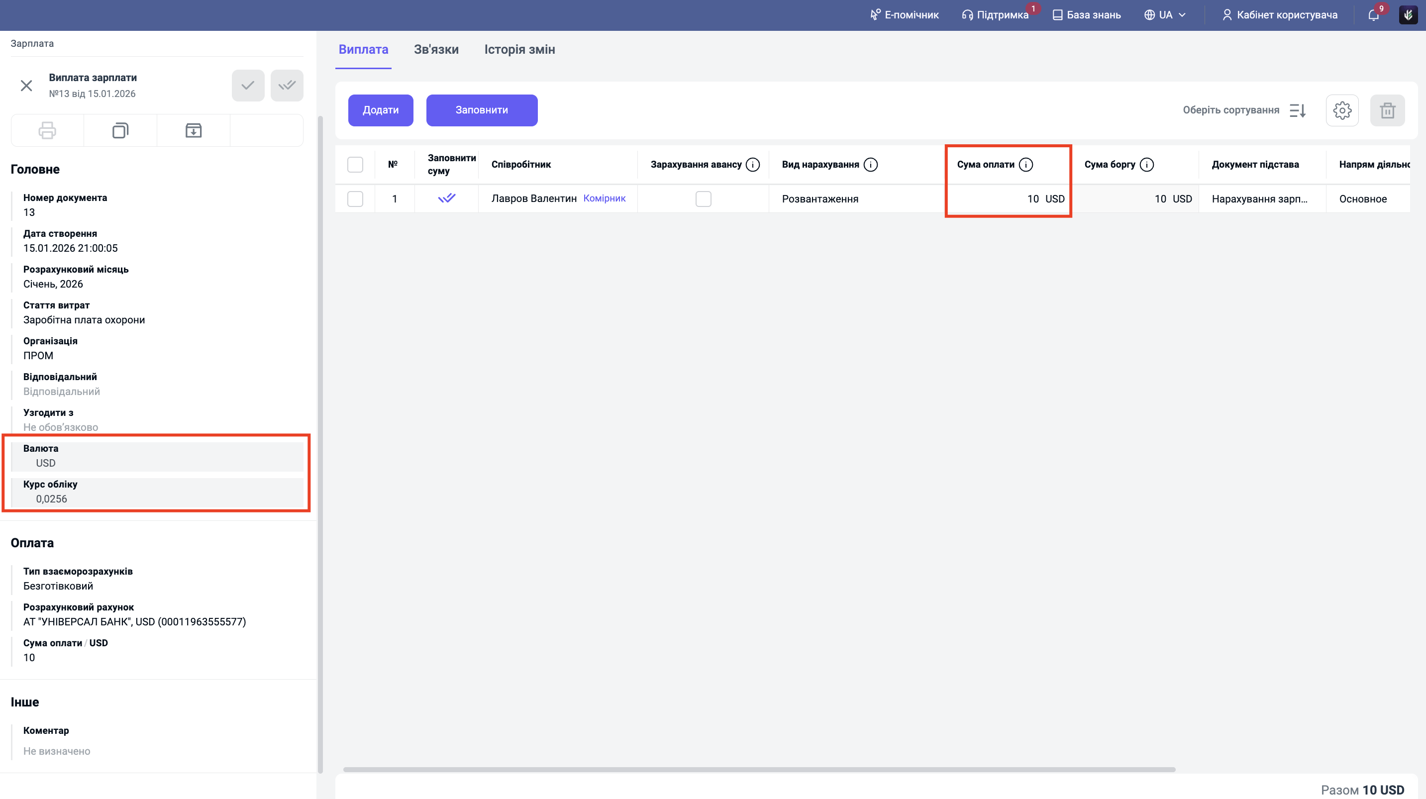 Курс: Тут автоматично підтягнеться поточний курс валюти на момент створення виплати (з довідника валют).