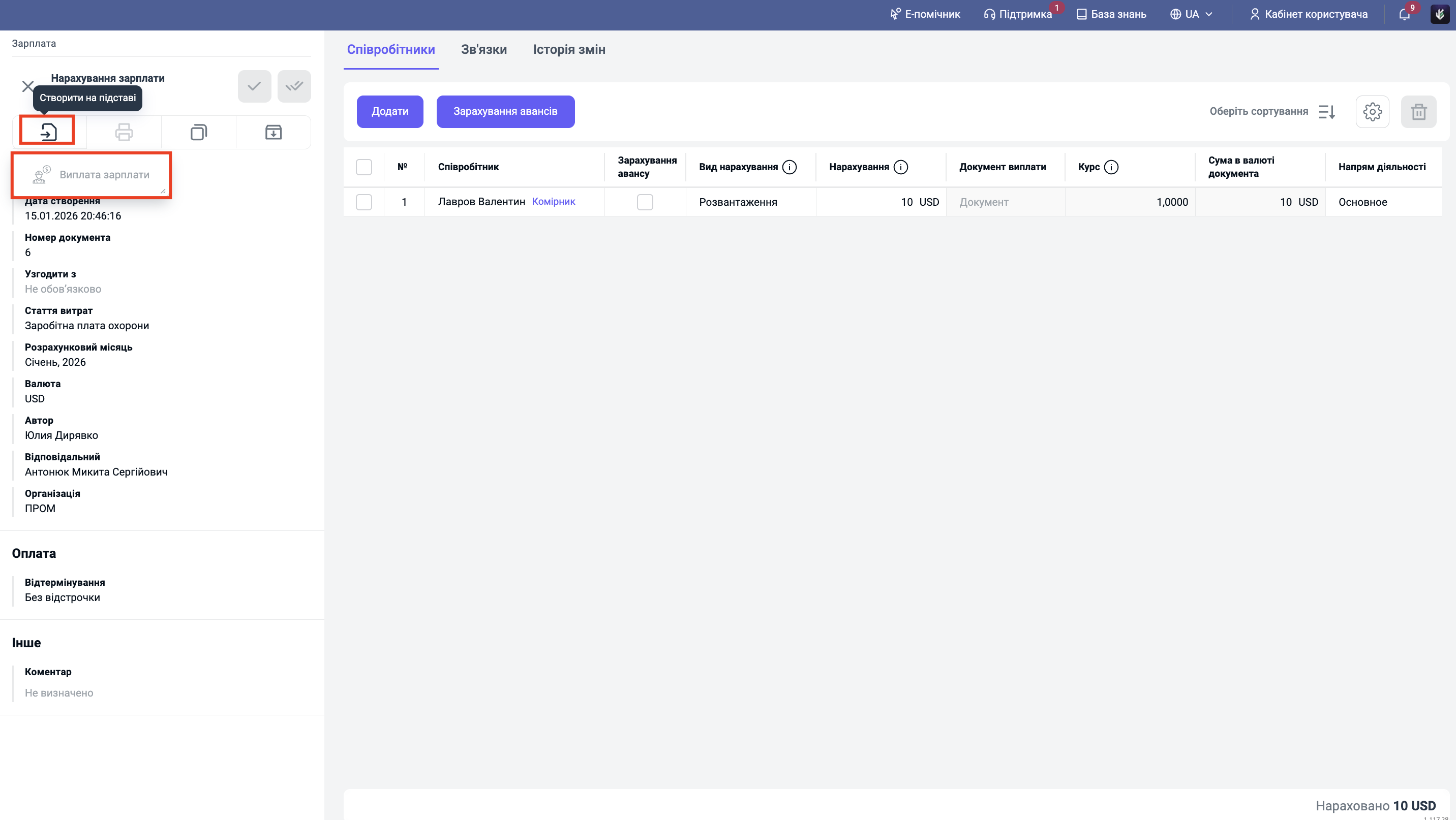 Натисніть "Створити на підставі" -> "Виплата зарплати".